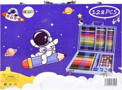 Pilns bērnu mākslas komplekts satur 128 detaļas elegantā zilā koferītī ar astronauta motīvu. Piedāvā visu zīmēšanai un gleznošanai: krāsainie zīmuļi, vaska krītiņi, temperas, ota, lineāls, dzēšgumija un asināmais. Ideāli piemērots radošuma un sīkās motorikas attīstīšanai, lieliska dāvana mazajiem māksliniekiem.