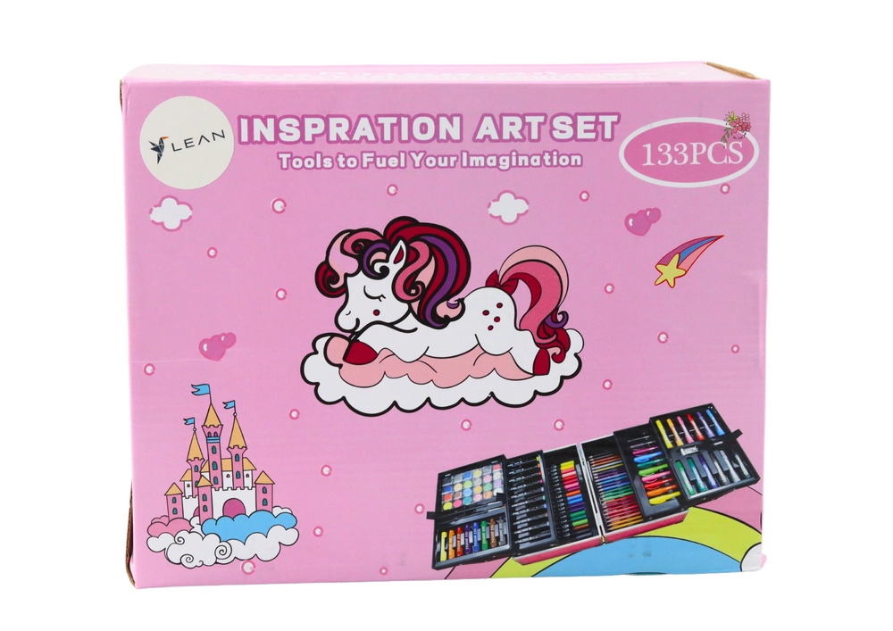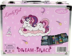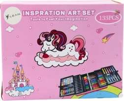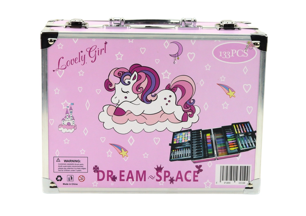 Pilns mākslas komplekts ar vienradža motīvu ērtā izvelkamā koferītī satur līdz pat 133 daļām zīmēšanai un gleznošanai. Tajā atradīsiet akril marķierus, divpusējus flomāsterus, pasteļkrāsas, grafīta un krāsainos zīmuļus, akvareļkrāsas, otām, dzēšgumiju, asināmo un arī krāsojamās lapas. Ideāli bērniem no 3 gadu vecuma, veicina radošumu un sīkās motorikas attīstību, kā arī ir viegli pārnēsājams, pateicoties kompaktajiem izmēriem un rokturim.