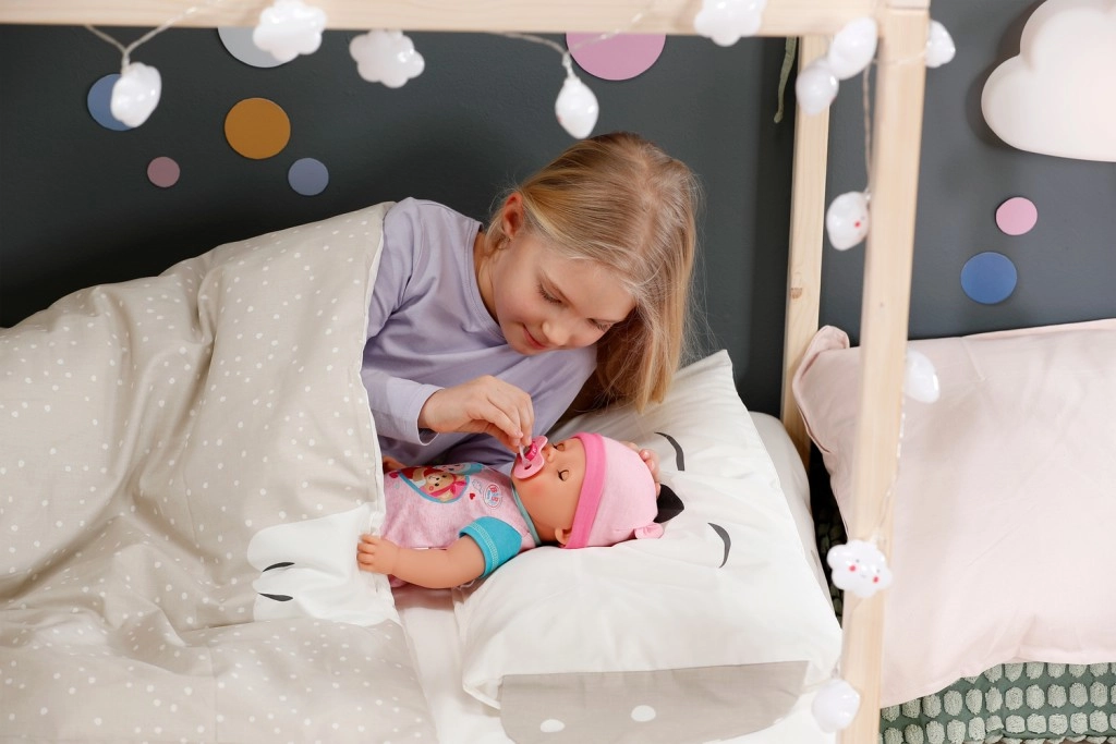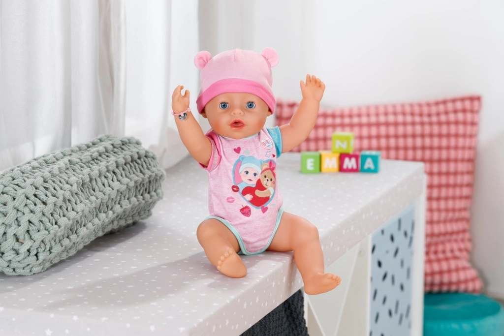 Ieniriet Baby Born pasaulē ar lelli Emmu, kas ierodas savā apburošajā jaunajā tērpā un piedāvā desmit reālistiskas funkcijas. Šajā komplektā ir arī desmit jautri piederumi, piemēram, burvju šķīvis, karote, knupītis, pudelīte, autiņš un podiņš ar ūdens funkciju. Emma prot dzert, raudāt īstas asariņas, gulēt, peldēties un piepildīt savu autiņu. Acis atveras un aizveras ar grozāmu knupīti. Nav nepieciešamas baterijas un piemērota bērniem no 3 gadu vecuma.