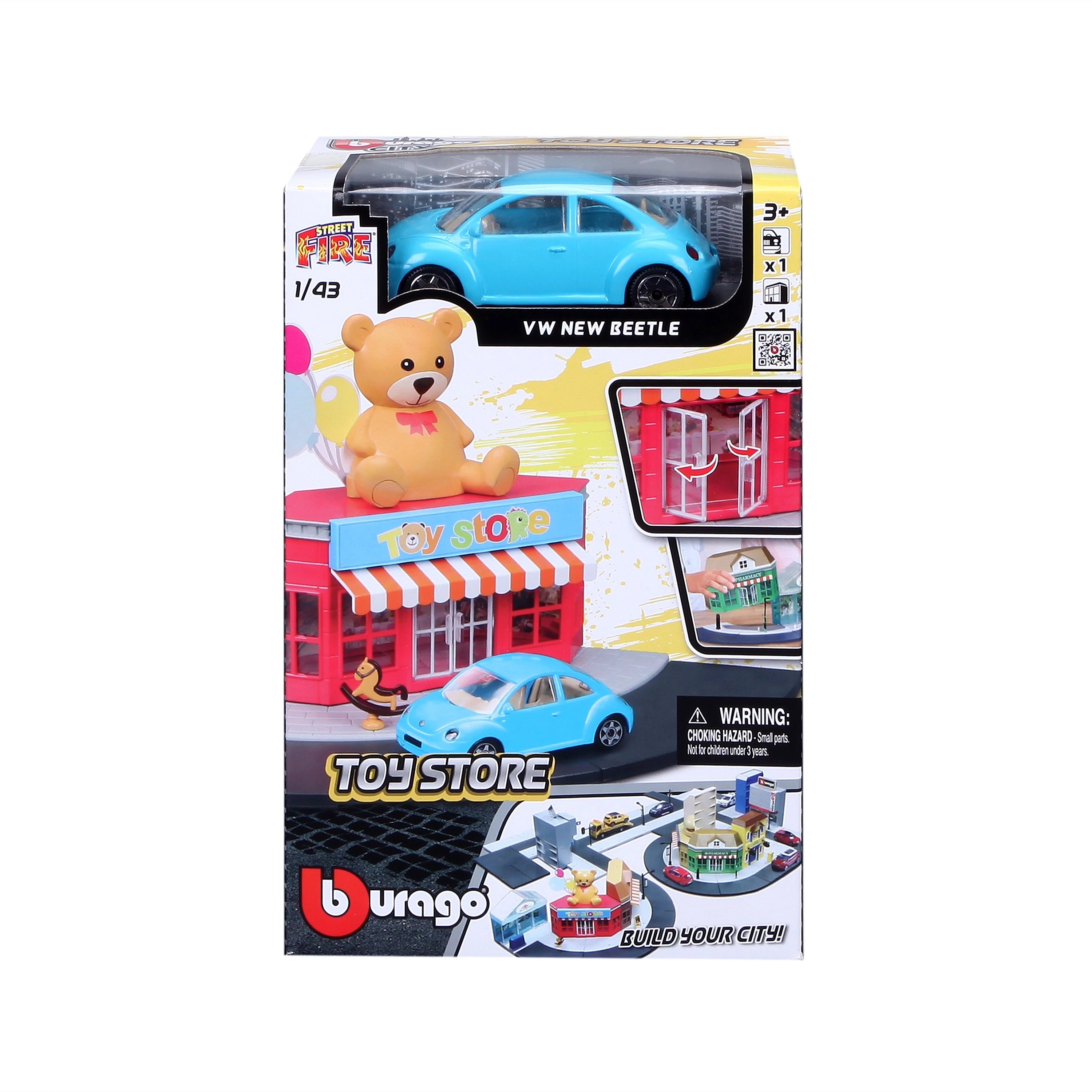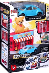 Uzbūvējiet savu pilsētu ar spēļu komplektu Bburago City Rotaļlietu veikals 1:43. Metāla automašīnas modelis mērogā 1:43, plastmasas ēka ar kustamām durvīm, ielu un ietvju elementi un dažādi aksesuāri radošai spēlei. Komplektu var kombinēt ar citiem setiem no sērijas StreetFire.