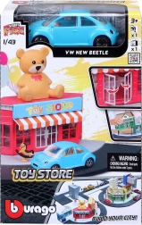 Paplašiniet savu pilsētas kolekciju ar komplektu Bburago City Rotaļlietu veikals 1:43, kas piedāvā reālistiskas detaļas un lieliskas spēļu iespējas. Iekļauts Bburago metāla automašīnas modelis ar precīzi izstrādātu virsbūvi un daudzām detaļām, plastmasas rotaļlietu veikala ēka ar kustamām durvīm un aksesuāri ielas veidošanai.