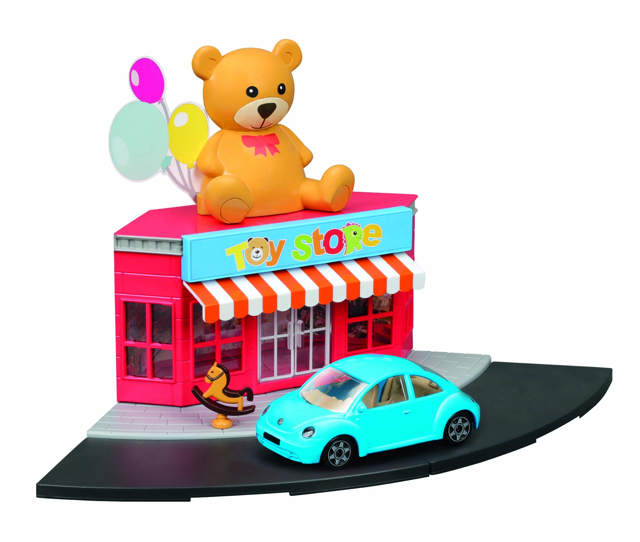 - Plastmasas rotaļlietu veikala ēka, 1:43 metāla automašīnas modelis, ielu un ietvju elementi, aksesuāri