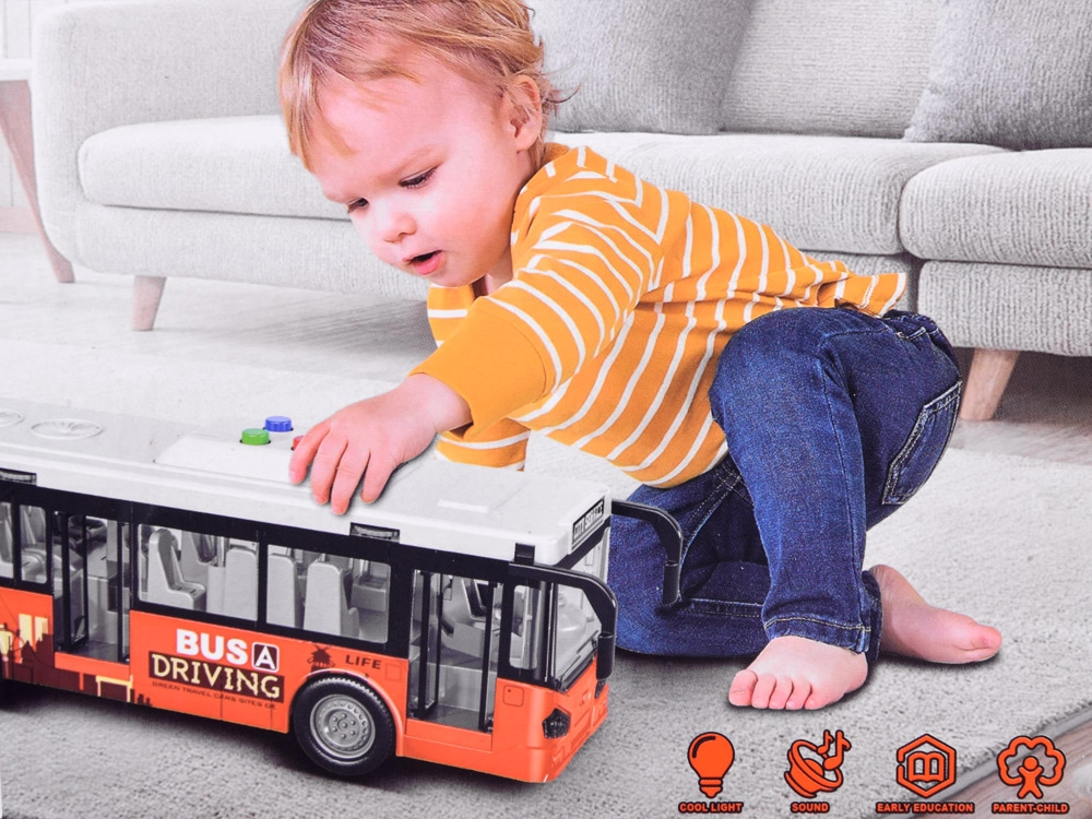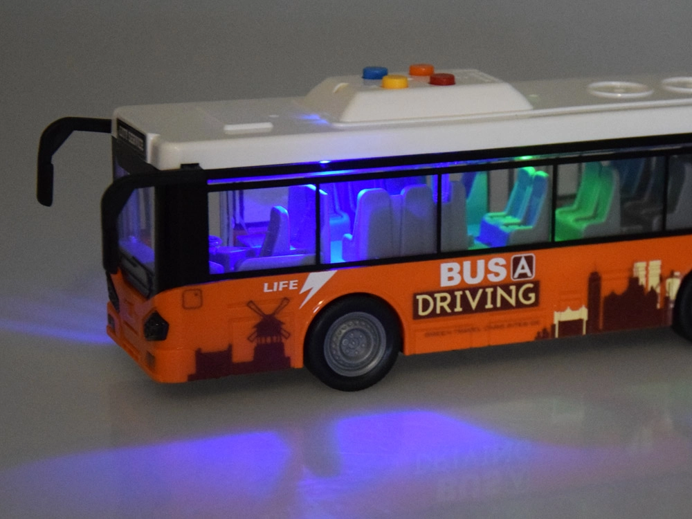Autobusa jumtā ir četras pogas skaņas un gaismas funkcijām: dzeltenā poga – pieturas un durvju atvēršanas skaņa, zilā poga – motora iedarbināšanas skaņa, sarkanā poga – skaņas signāls, oranžā poga – atpakaļgaitas skaņa. Skaņas pavada krāsainas mirgojošas gaismas autobusa kabīnes iekšpusē. Rotaļlietu darbina 3 x AG13 baterijas (iekļautas komplektā).
