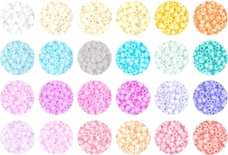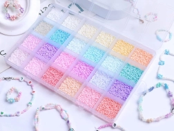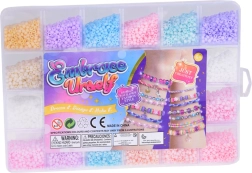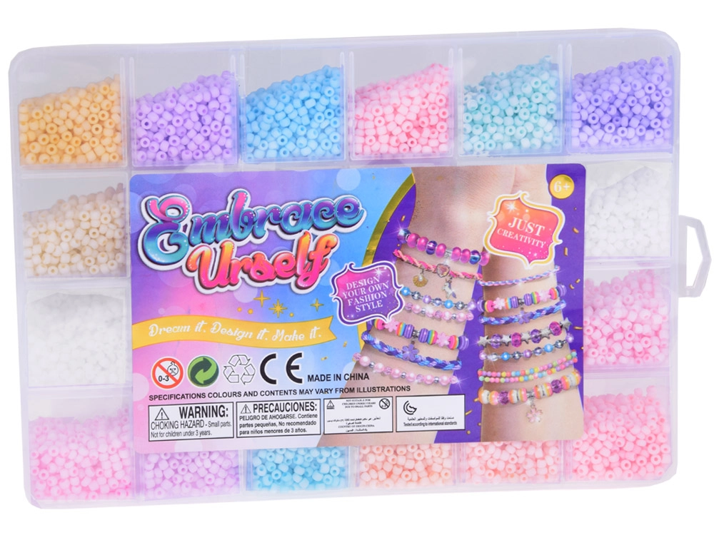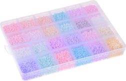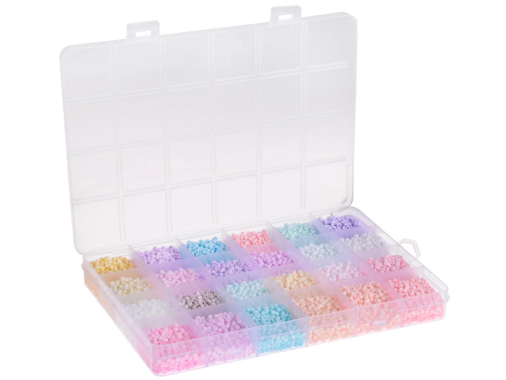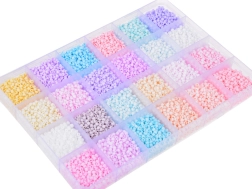 Iekļautas 24 dažādas pasteļkrāsas krellītes: rozā, violetas, zilas, bēšas, zaļas, baltas un dzeltenas. Tās sakārtotas caurspīdīgā, iegarenā iepakojumā ar praktiskām nodalījumu sadaļām. Tas novērš krellīšu sajaukšanos un atvieglo to organizēšanu.