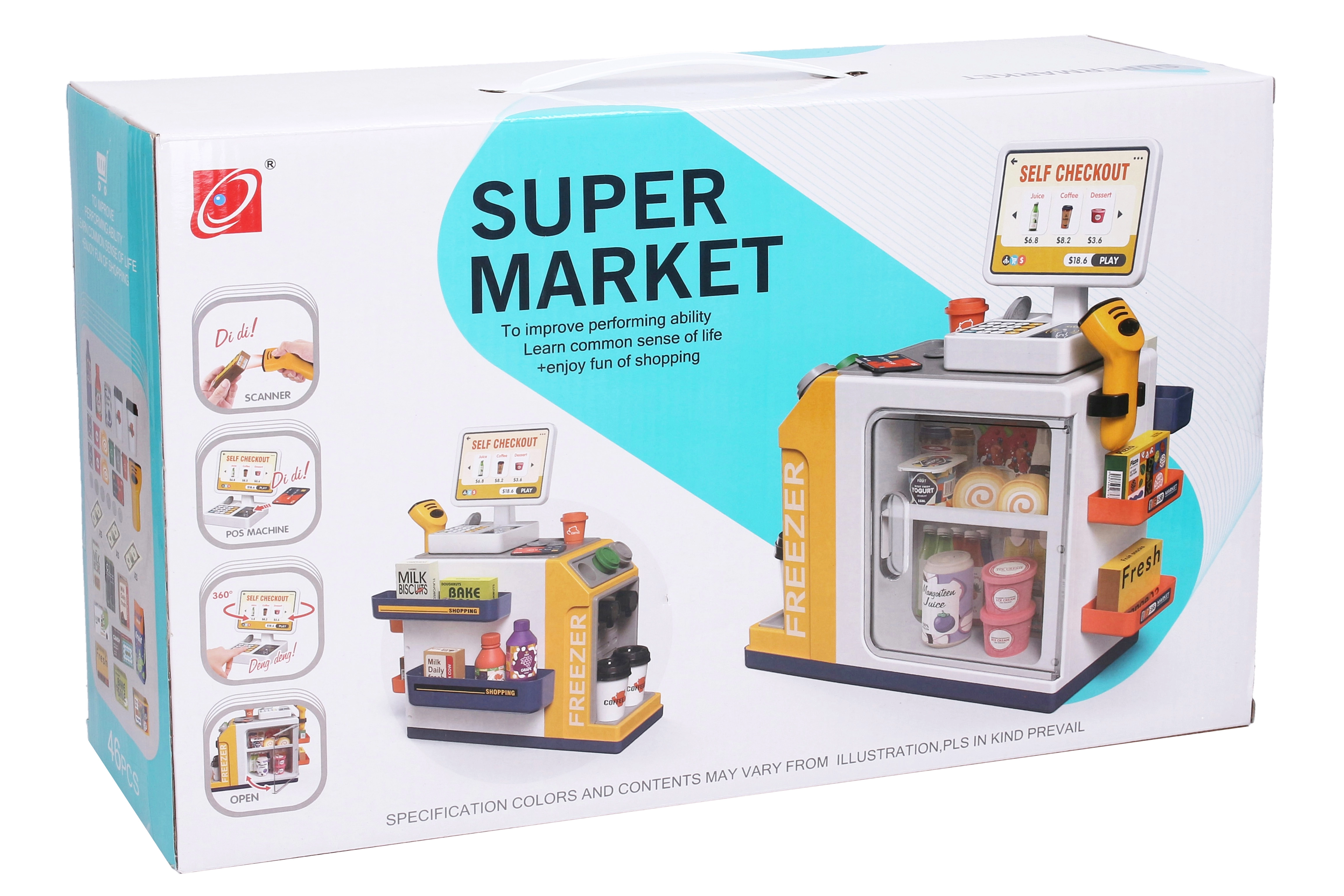 Šis Supermarketu komplekts ir lieliska rotaļlieta visiem mazajiem iepirkšanās entuziastiem. Komplektā ir viss, ko varētu sagaidīt īstā lielveikalā: galdiņš ar kases aparātu, rokas skeneris, norēķinu karte, papīra banknotes un monētas. Spēlēm “veikalos” iepakojumā atradīsiet arī kafijas, sulu, jogurtu, piena, suši un saldumu imitācijas.