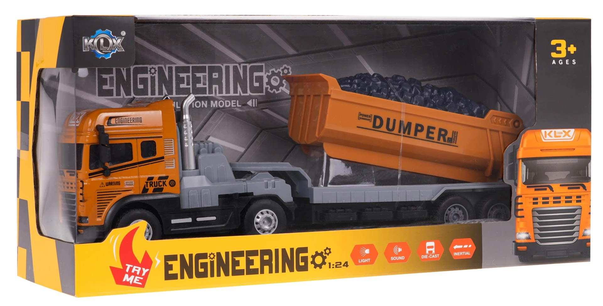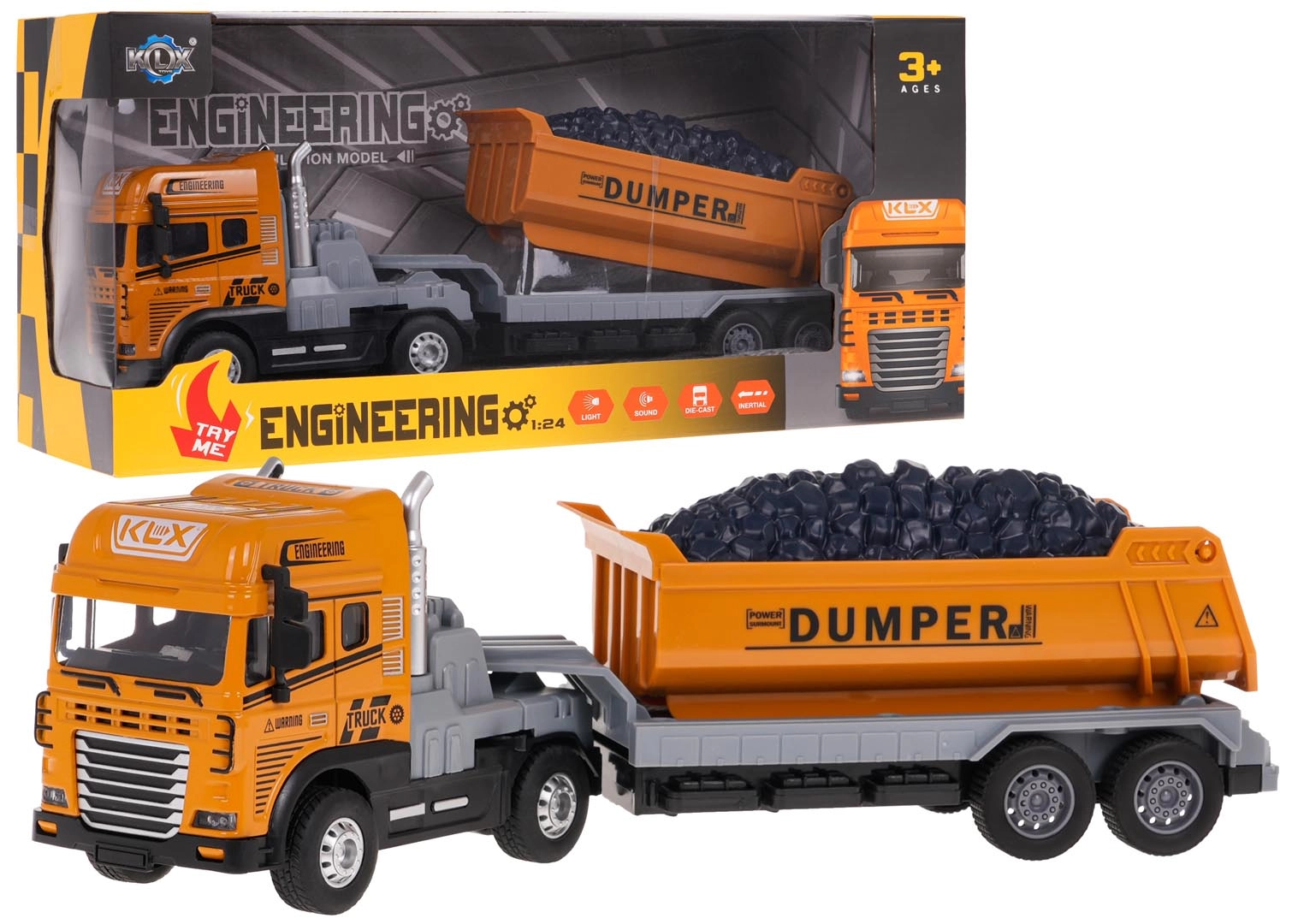 Pateicoties spīdošiem priekšējiem lukturiem un reālām skaņām (braukšana, signāls, atpakaļgaita), rotaļlieta šķiet ļoti īsta. Gumotie protektori nodrošina lielisku saķeri, aizmugures riteņu piedziņa piešķir stabilitāti, bet atvienojama piekabe ļauj veidot dažādus scenārijus. Darbojas ar 3× AG3 baterijām, kas iekļautas komplektā.
