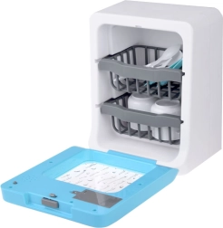 Viegla trauku ielikšana, pateicoties atveramām durtiņām un divu līmeņu groziem kā īstā trauku mazgājamajā mašīnā.