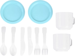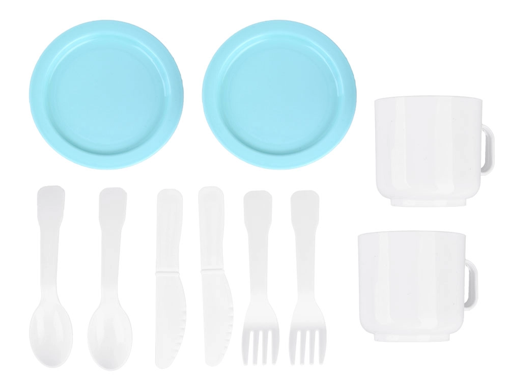 - Bagātīgs piederumu komplekts: 2 krūzītes, 2 šķīvji, 2 dakšiņas, 2 karotes, 2 naži.