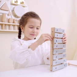 Komplektā ir dažādi instrumenti, piemēram, tamburīni, marakas un ksilofons, kas veicina muzikālo mācīšanos un ritma prasmju attīstību.