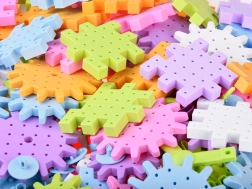 Klucīši ir pieejami daudzās krāsās, piemēram, zilā, zaļā, rozā, oranžā un baltā, kas veicina bērnu radošumu un telpiskās prasmes.