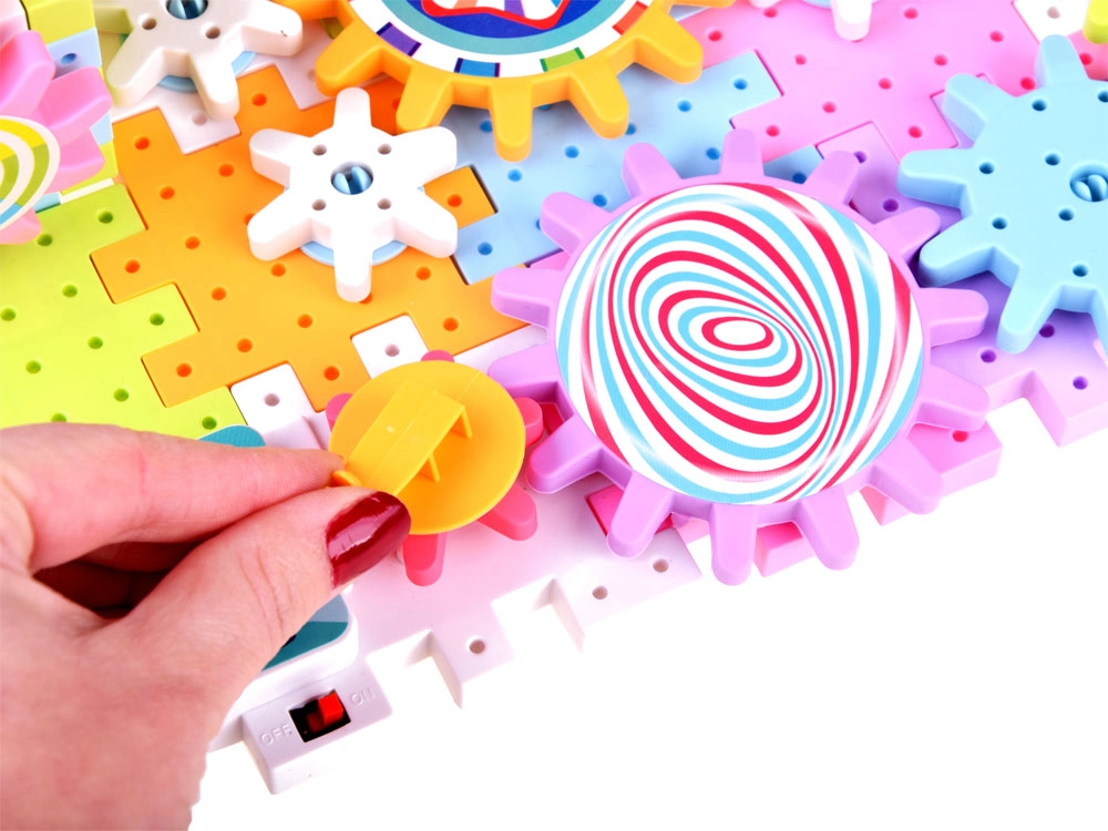 Komplektā ir zobrati un mazas lāpstiņas ar dzīvnieciņiem, kas var griezties, attīstot koordināciju un problēmu risināšanas prasmes.