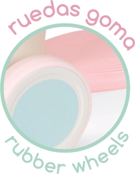 Grozāma stūre ar drošības sistēmu novērš pirkstiņu iespiešanu un nevēlamu pārgrozīšanos. Gumijotie rokturi labi turas arī mazās rociņās.