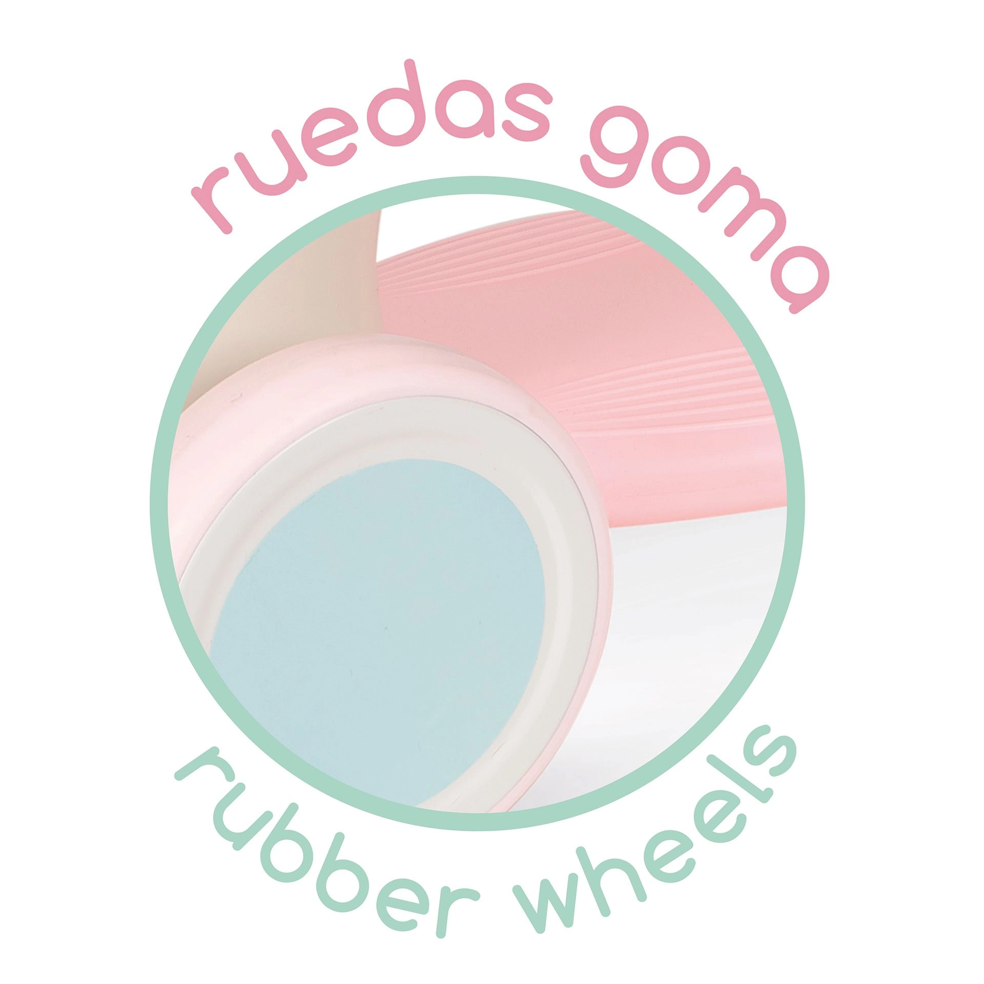 Gumijotie riteņi nodrošina klusu gaitu un drošu saķeri ar segumu. Stabilā četrriteņu konstrukcija palīdz apgūt līdzsvaru iesācējiem braucējiem.