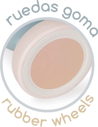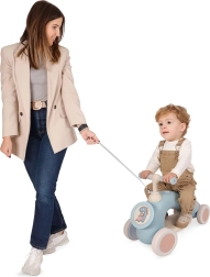 Pārdomātas detaļas palielina komfortu un drošību: pagriežama stūre ar aizsardzību pret pirkstu iespiešanu, mīksti gumijoti rokturi un klusi riteņi vienmērīgai gaitai. Kāju balsts atvieglo nogurušām kājiņām, bet vilkšanas siksna (100 cm) ļauj vecākiem bērnu ērti vadīt. Nelielais svars atvieglo pārnešanu un glabāšanu.