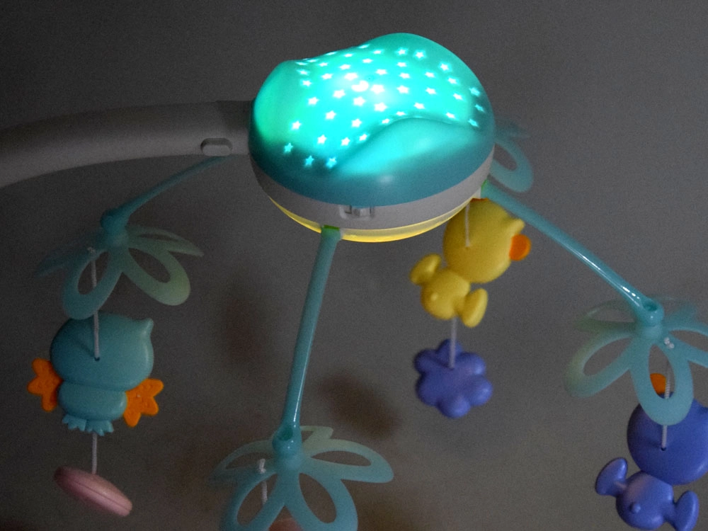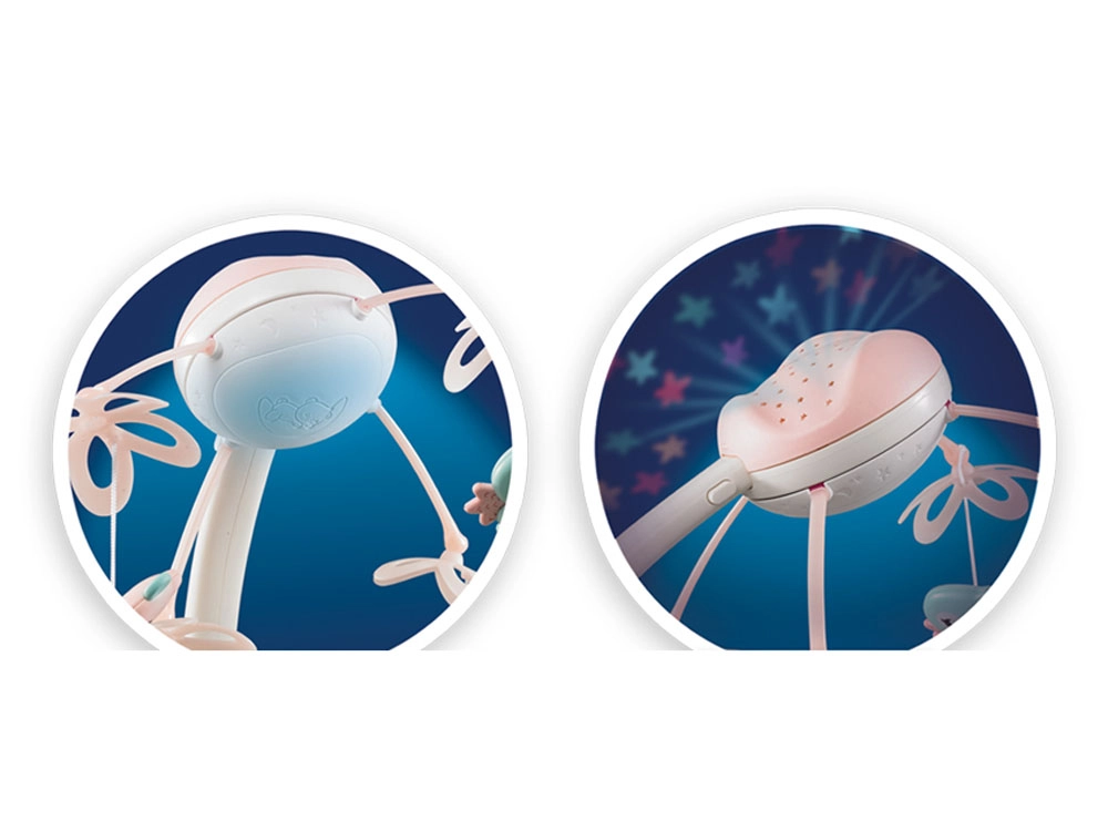 Karuselis ir izstrādāts, lai veicinātu nomierināšanos un maņu attīstību jau no dzimšanas. Iebūvētais projektors uz griestiem un sienām projicē maigas zvaigznītes, bet iebūvētā muzikālā kastīte atskaņo melodijas, šūpuļdziesmas, dabas un dzīvnieku skaņas. Pateicoties tālvadībai, varat ieslēgt vai pieklusināt karuseli pat no blakus istabas.