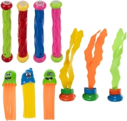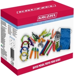 Šis visaptverošais niršanas un ūdens spēļu komplekts ir radīts izklaidei un peldēšanas prasmju attīstīšanai. Pateicoties spilgtām krāsām un dažādām formām, bērni viegli atrod priekšmetus zem ūdens, trenē orientēšanos, niršanu un kustību koordināciju. Punktu marķējums uz atsevišķām detaļām veicina veselīgu sacensību garu un rada daudz spēļu scenāriju.