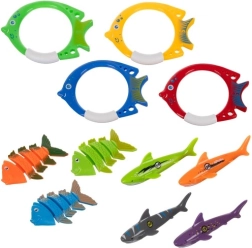 Izbaudi vasaru ar šo lielo niršanas rotaļlietu komplektu baseinam! Krāsainas zivtiņas, riņķi, nūjiņas, haizivju torpēdas un pirātu dārgumi pārvērtīs katru peldi piedzīvojumā. Rotaļlietas ātri grimst līdz dibenam, ir labi redzamas, un daudzām ir punktu marķējums sacensībām. Komplektā iekļauta vieglā, ātri žūstoša soma ērtai pārnēsāšanai.