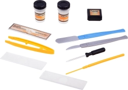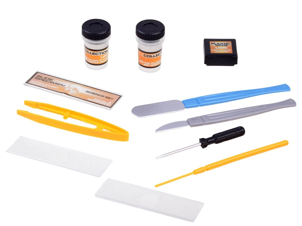 Iepakojumā atradīsiet priekšmetstikliņus, paraugu trauciņus, pinceti, pilinātāju, skalpeli, adatu un citus rīkus – viss gatavs mājas eksperimentiņiem.
