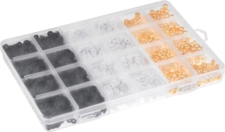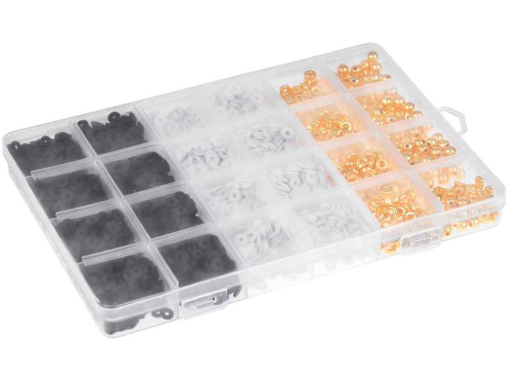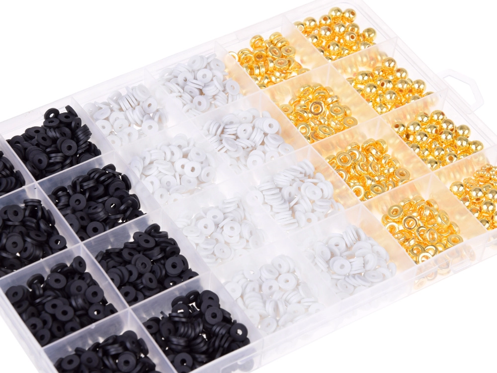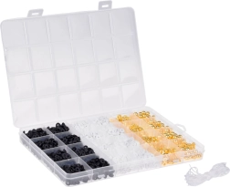 Komplektā ir iekļauta caurspīdīga plastmasas kastīte ar vairākām nodalījumu sekcijām. Tas nodrošina ērtu piekļuvi un pērlīšu sakārtošanu dažādos stilos un krāsās.