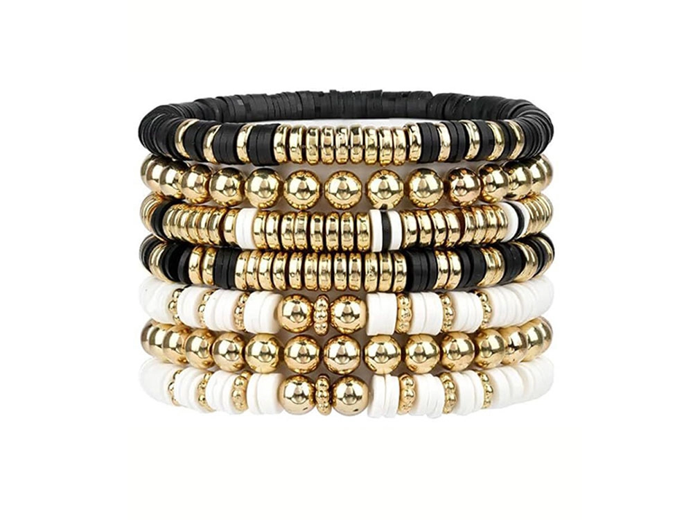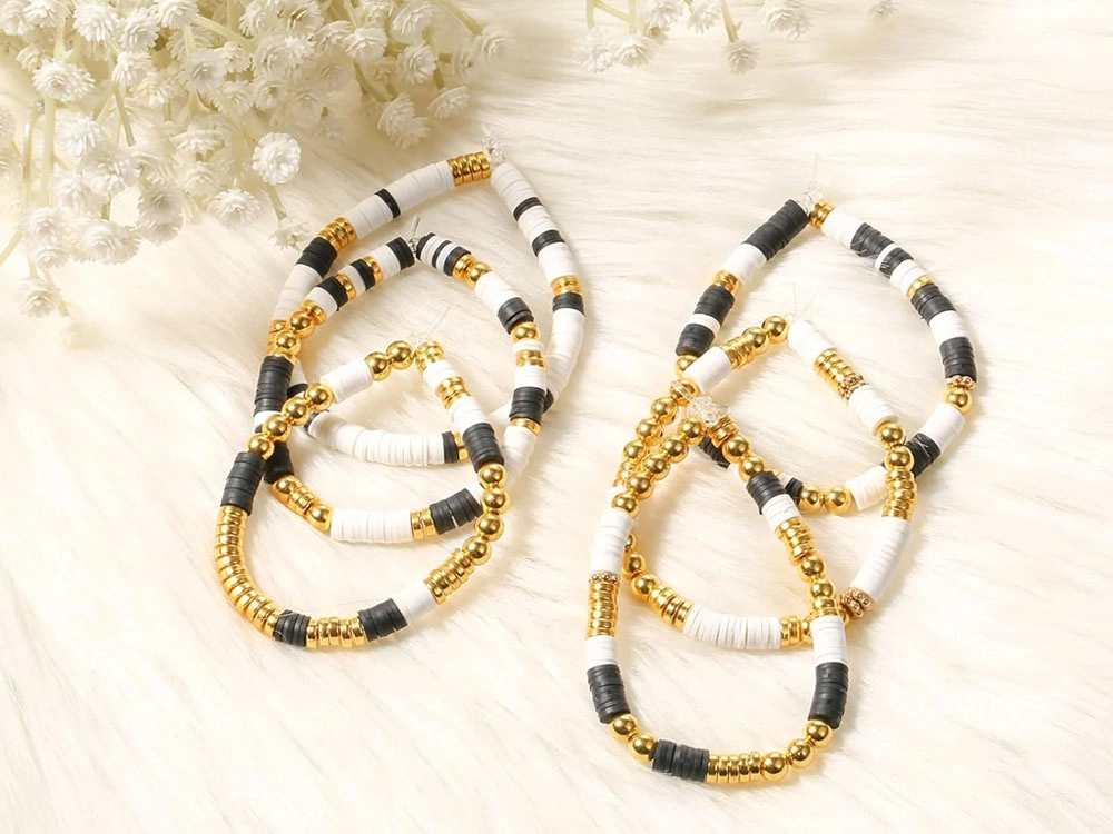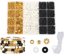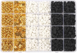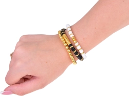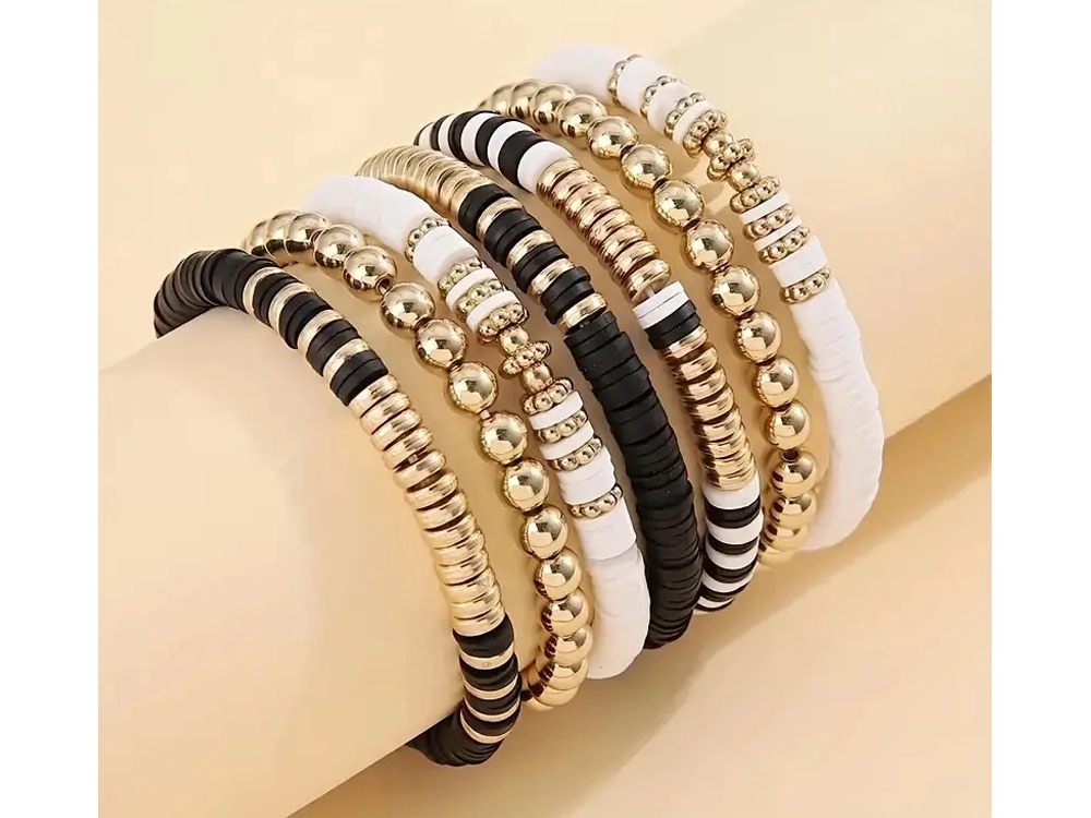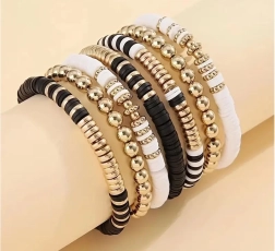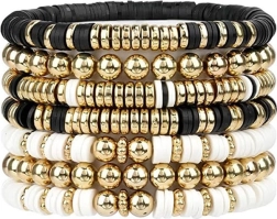 Stilīgas aproces no šī komplekta veidotas no melnām, baltām un zelta pērlītēm, kas rada izsmalcinātu slāņotu izskatu, ideāli piemērotu jebkurai situācijai.