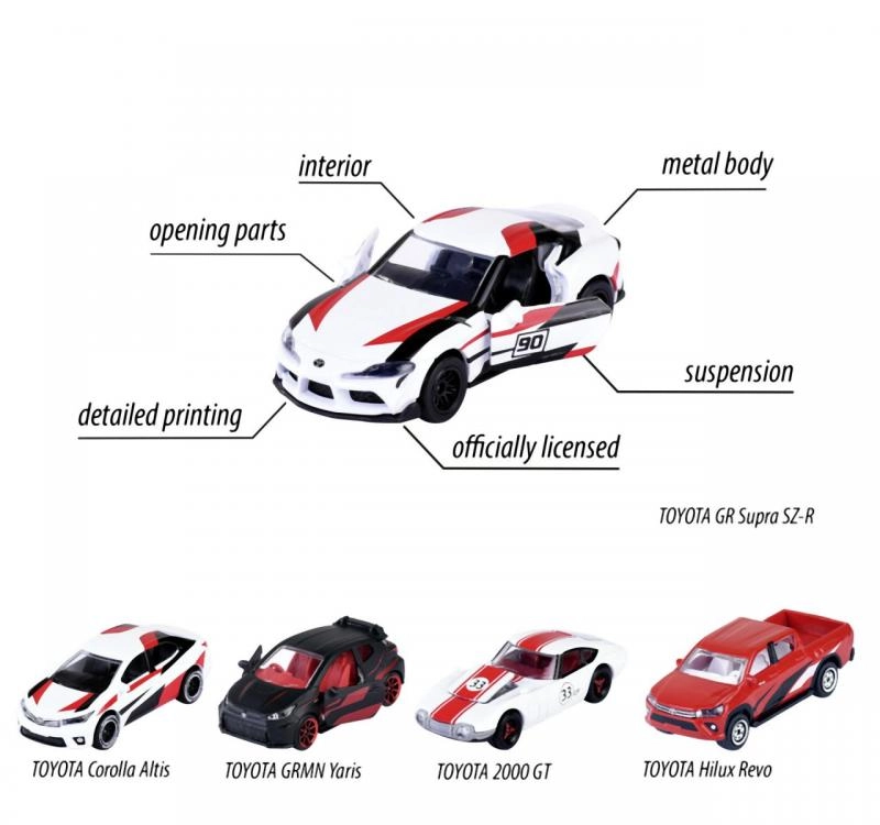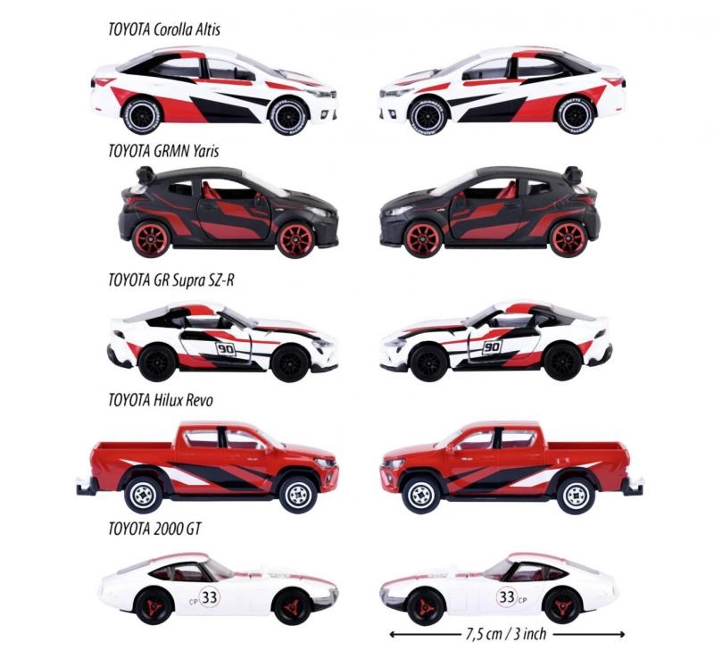 Komplektā ietilpst GR Supra, GRMN Yaris, Hilux Revo, Corolla Altis un 2000 GT – lieliska kolekcijas bāze vai dāvana zīmola entuziastiem.