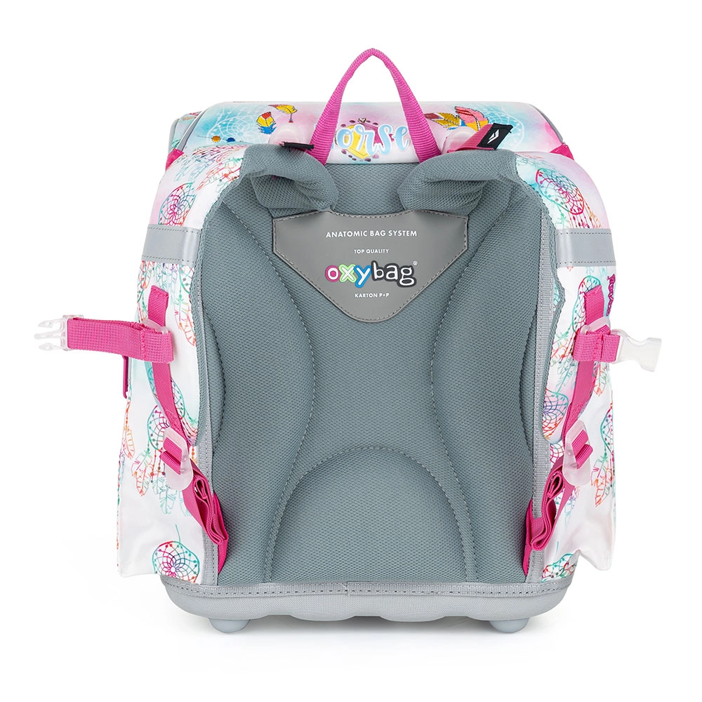 Skolas komplekts OXYBAG Premium Light – zirgs Romantic apvieno ultravieglu un vienlaikus stabilu mugursomu ar pārdomātu aprīkojumu ērtai ikdienas nēsāšanai. Elpojošais polsterējums, platas mīkstinātas lences un krūšu siksna nodrošina drošu piegulšanu un vienmērīgu slodzes sadalījumu. Pievilcīgais zirga motīvs maigos toņos ar sapņu ķērājiem patiks visiem zirgu mīļotājiem.