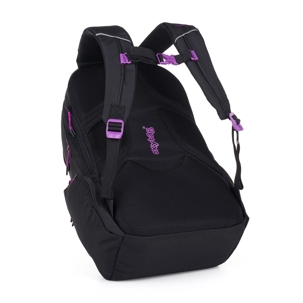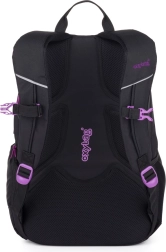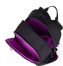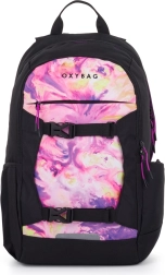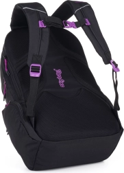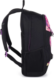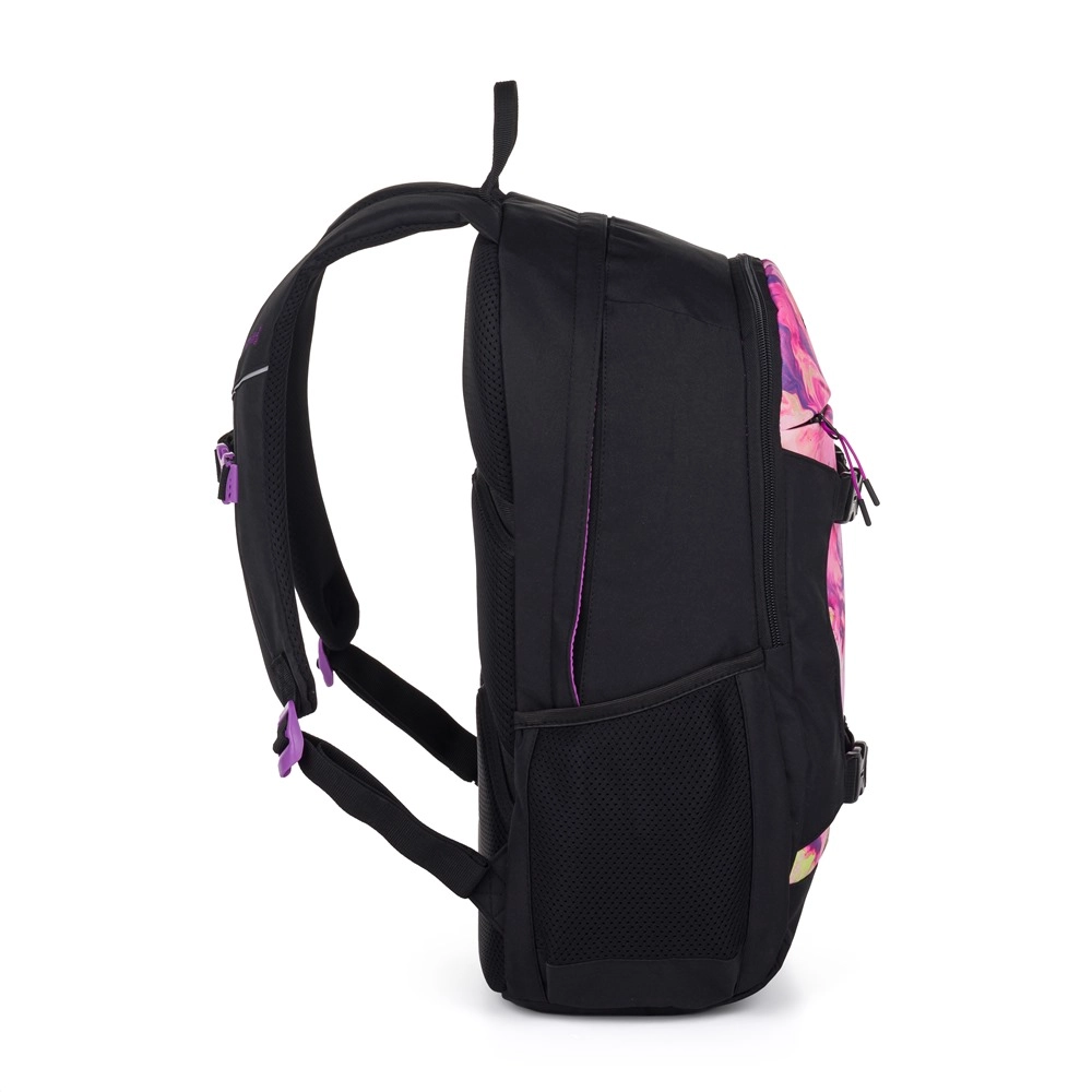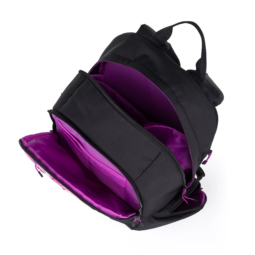 Melnā pamatne papildināta ar rozā–violetu marmora rakstu un izteiktiem akcentiem. Mugursoma piemērota skolai, darbam un brīvajam laikam.