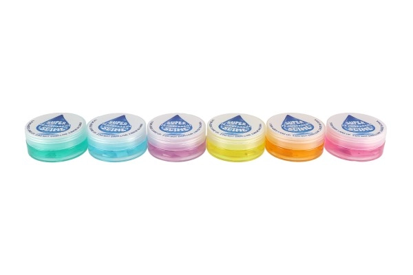 Atklājiet fascinējošus krāsu miksiņus, ko piedāvā katrs slaima trauciņš – zaļa, zila, violeta, dzeltena, oranža un rozā.