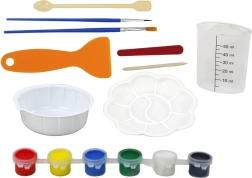 Sešas krāsas, palete, otas, špakteļlāpstiņa, bļodiņa, mērbļodiņa un vīlētājs – bērni var sākt uzreiz un izmēģināt dažādas jaukšanas un krāsošanas tehnikas.