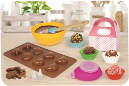 Iekļautas bļodiņas, lāpstiņas un formiņas, kas bērniem nepieciešamas šokolādes gardumu pagatavošanai.