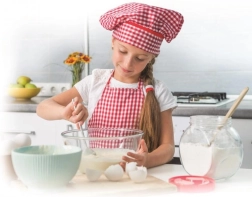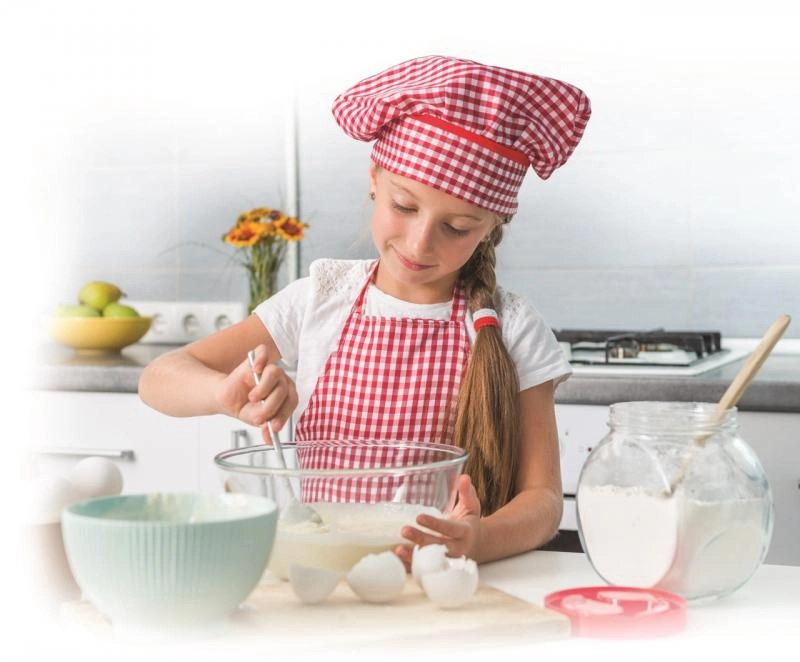 Meitene virtuvē rotaļīgā veidā māca bērniem cepšanas un gatavošanas pamatus.
