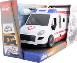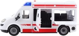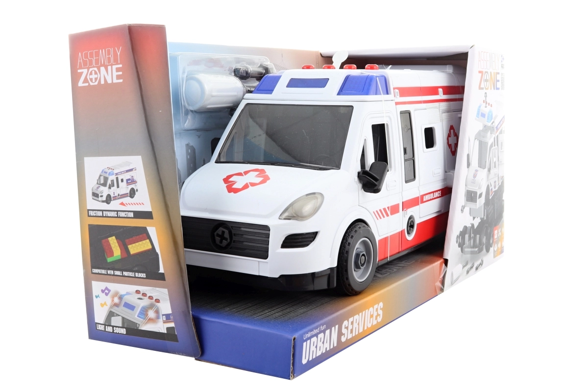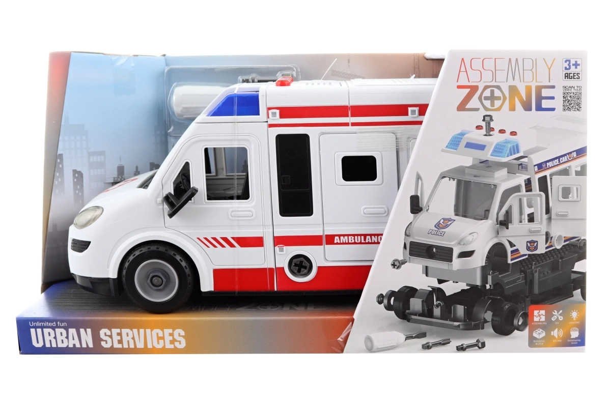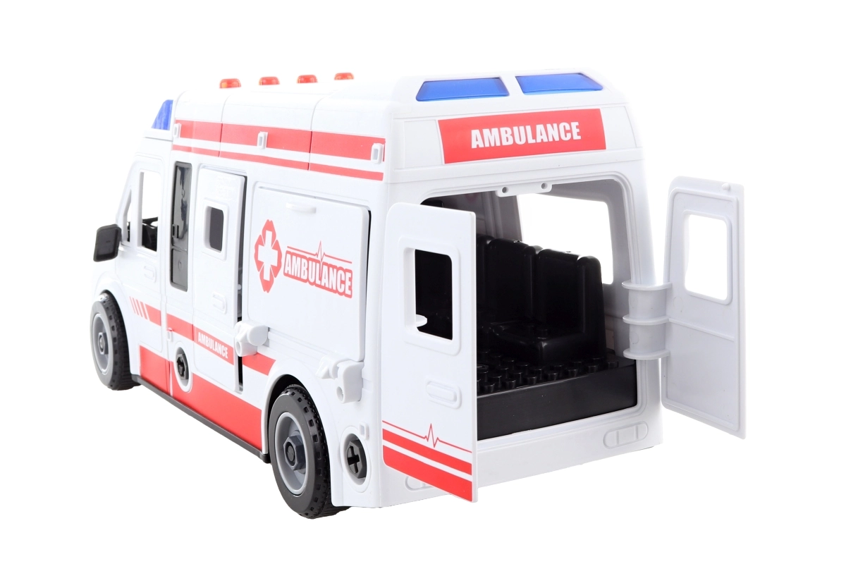Liela baterijām darbināma skrūvējama ātrās palīdzības mašīna bērniem no 3 gadu vecuma piedāvā autentiskas skaņas (sirēna, taurēšana, iedarbināšana, melodija), atveramas durvis vadītāja pusē un aizmugurē, kā arī baterijas un skrūvgriezis komplektā.