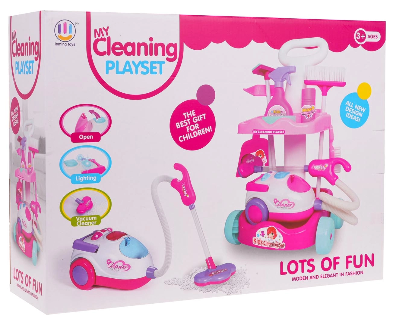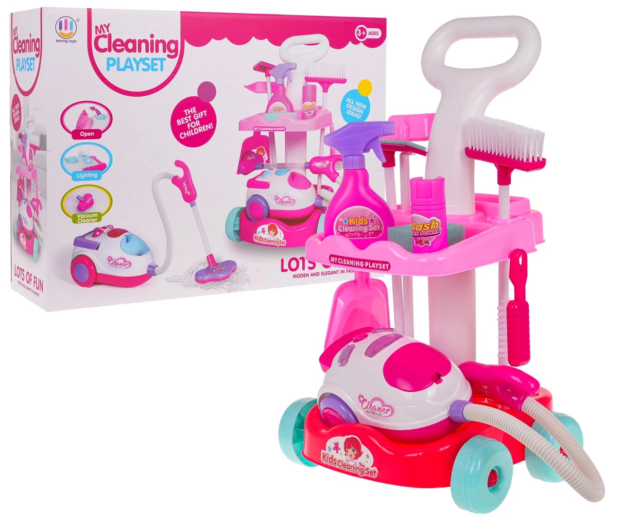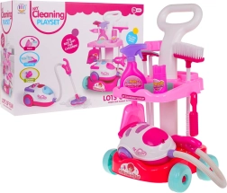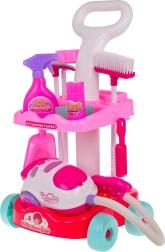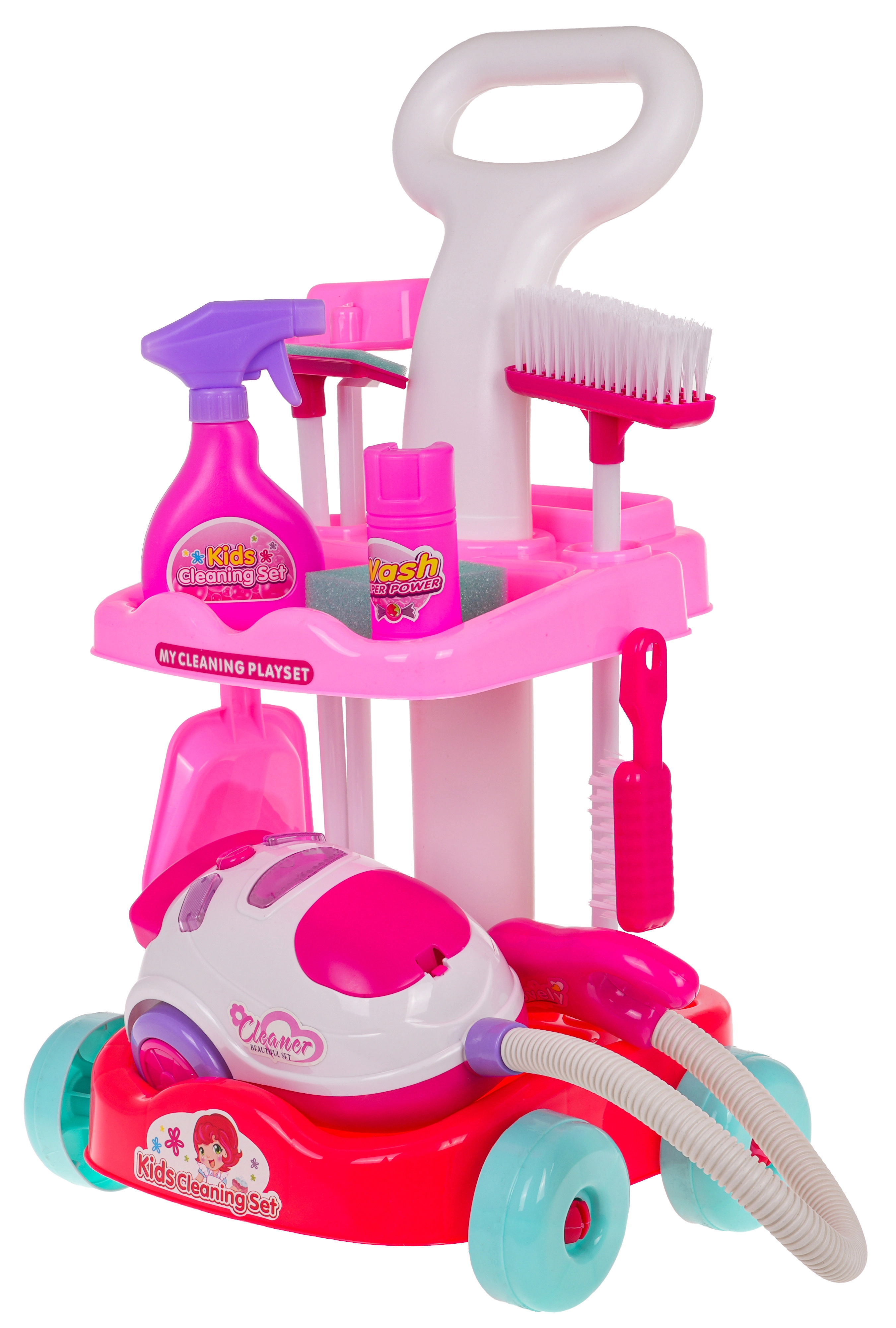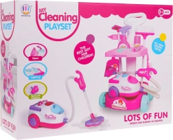 Šis bērnu uzkopšanas komplekts piedāvā visu, kas nepieciešams mazajiem saimniekiem: stabili ratiņi ar riteņiem un diviem plauktiem, interaktīvs putekļsūcējs ar gaismas un skaņas efektiem un plašs piederumu klāsts. Pateicoties drošam izpildījumam no izturīgas plastmasas un pievilcīgām krāsām, bērniem patiks atdarināt īstu uzkopšanu un vienlaikus mācīties uzturēt kārtību.