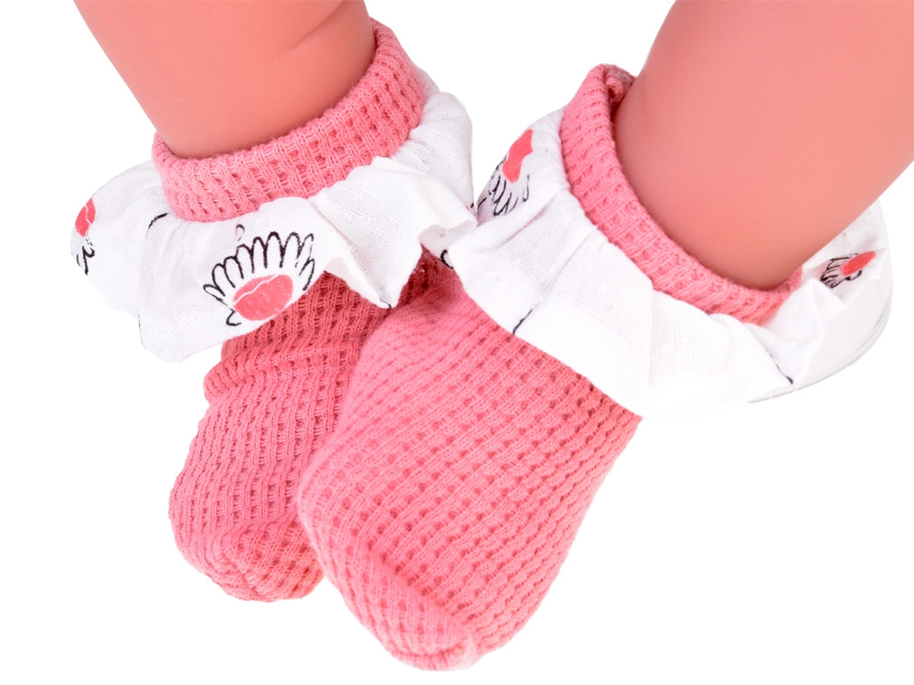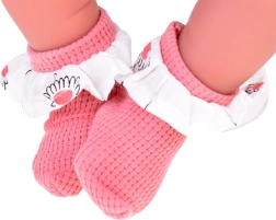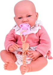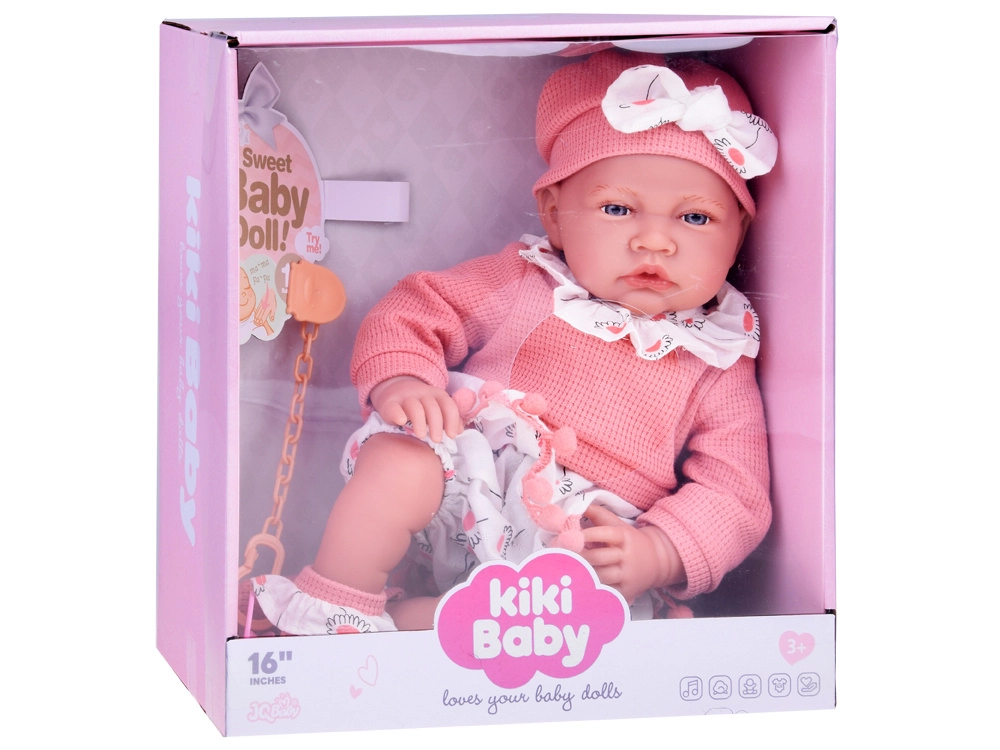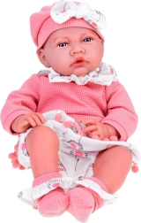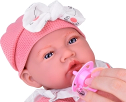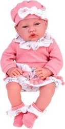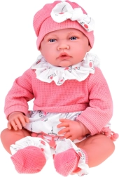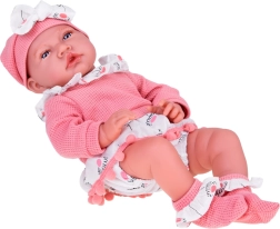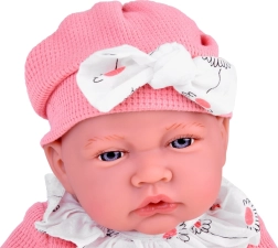 Mīļš interaktīvs bēbītis 45 cm augstumā iepriecinās ikvienu bērnu. Tam ir mīksts ķermenītis, kustīgas ekstremitātes no mīkstas gumijas, reālistiskas sejas vaibsti un lielas acis ar skropstām. Par izklaidi parūpēsies 12 skaņu funkcijas, rozā knupītis ar klipsi un maigs rozā komplekts ar tuniku, biksītēm, cepurīti un zeķītēm.