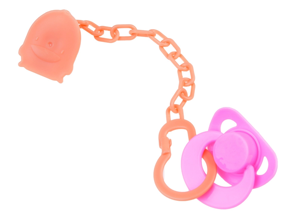 Stilīgs rozā komplekts ar volāniem un praktisks knupītis ar ķēdīti/klipsi, ko viegli piepiestiprināt pie drēbēm, lai nepazustu.