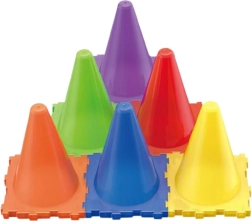 Stabili plastmasas konusi košās krāsās ir viegli izvietojami, lai pielāgotu spēles grūtības pakāpi.