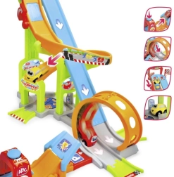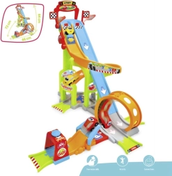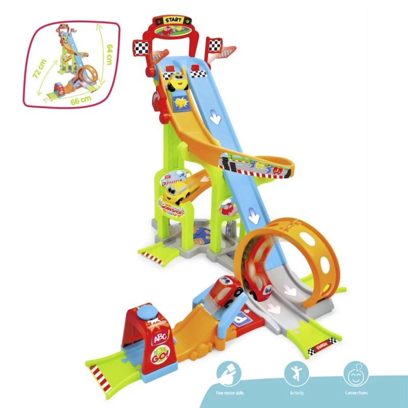 Izklaidējoša bērnu auto trase ar mašīnītēm nodrošina stundām ilgu darbību un radošumu. Tā piedāvā starta boksus, izšaušanas funkciju, loopingu, darbnīcu, autostāvvietu un barjeras. Lielais izmērs 66 × 72 × 64 cm un 2 mašīnītes komplektā garantē ātras sacīkstes un fantāzijas spēli pašiem mazākajiem.