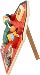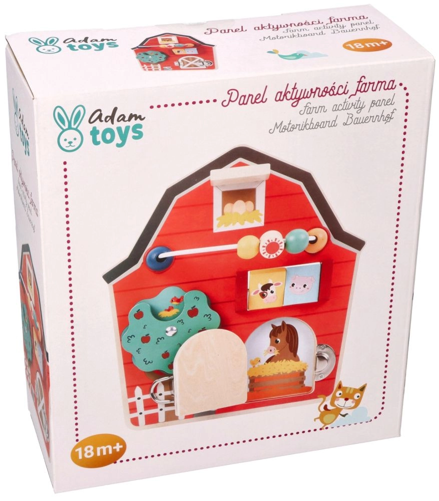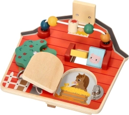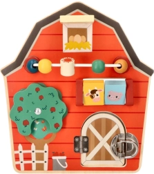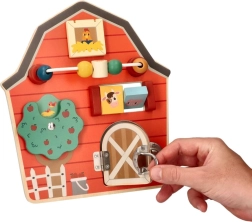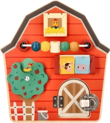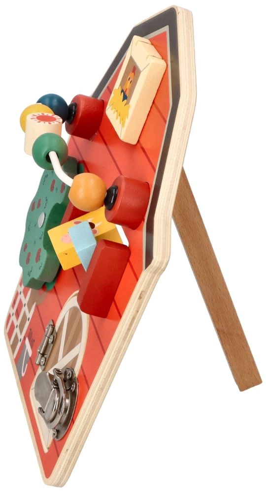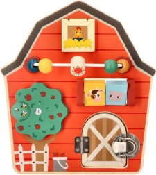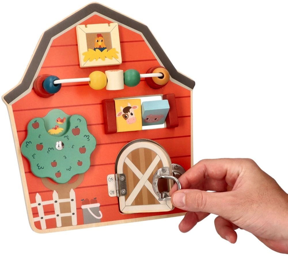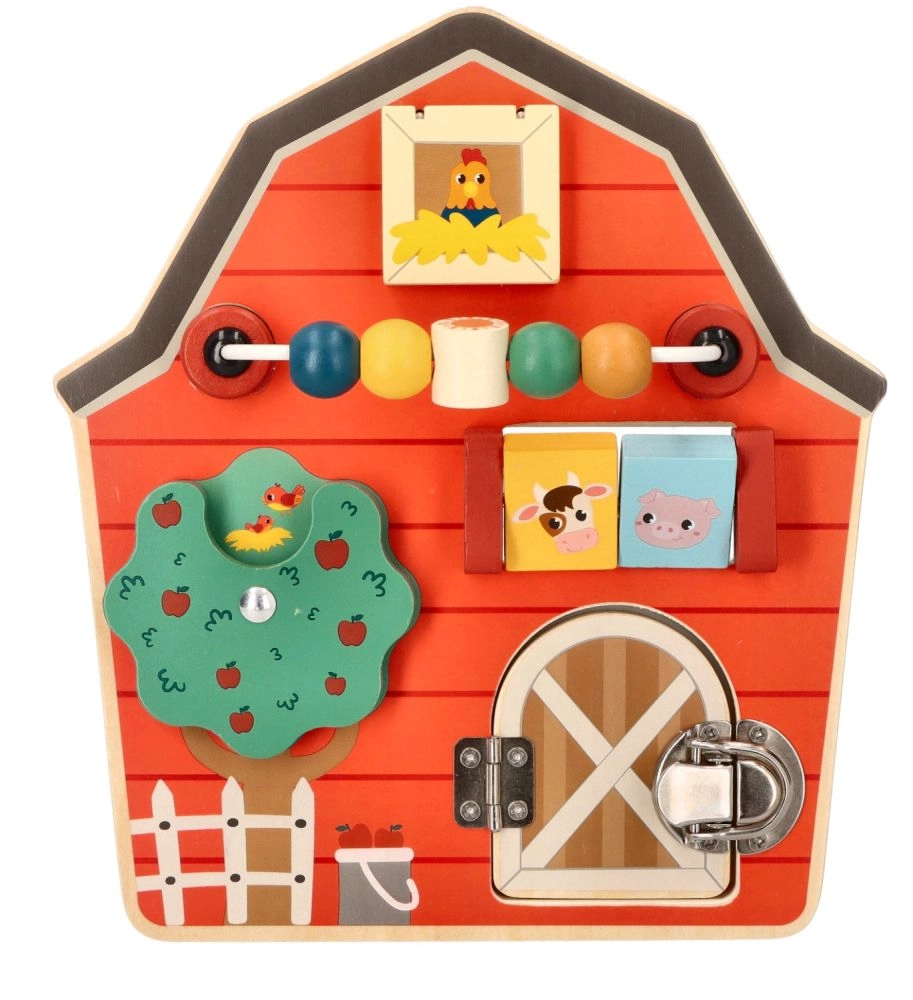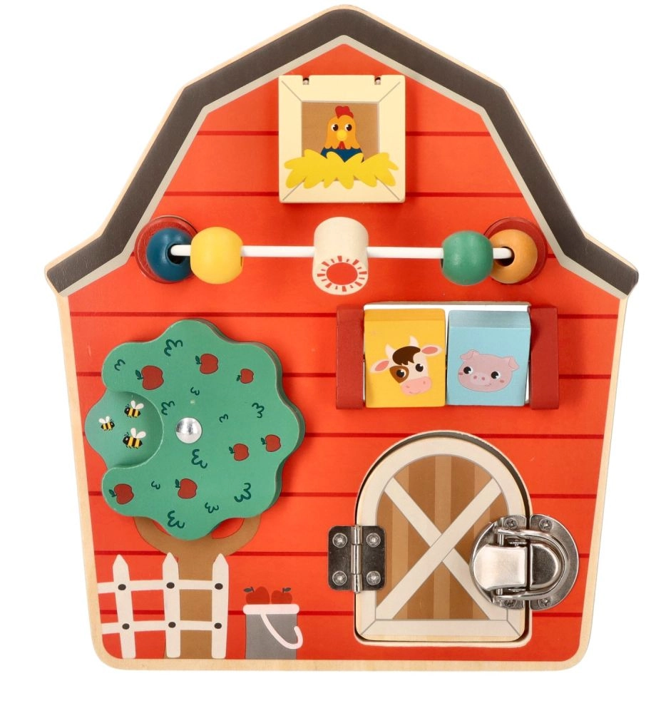 Šī koka aktivitāšu tāfele kūts formā ir izstrādāta, lai veicinātu bērnu sīko motoriku un rotaļīgu mācīšanos. Ar daudzveidīgu lauksaimniecības tematiku un krāsām tā ne tikai izglīto, bet arī izklaidē pašus mazākos ģimenes locekļus. Interaktīvie elementi, piemēram, bīdāmas krellītes, griežams koks un durtiņas ar aizšaujamo, palīdz attīstīt roku-acu koordināciju.