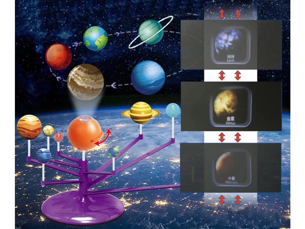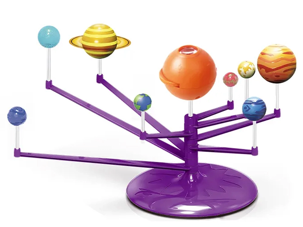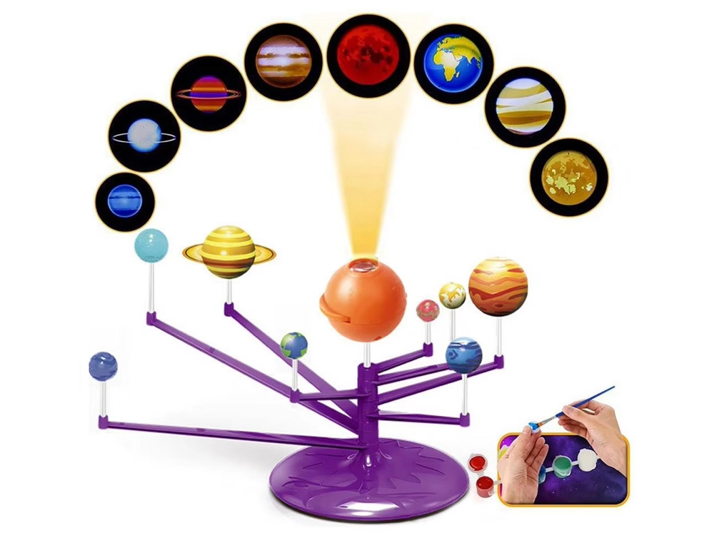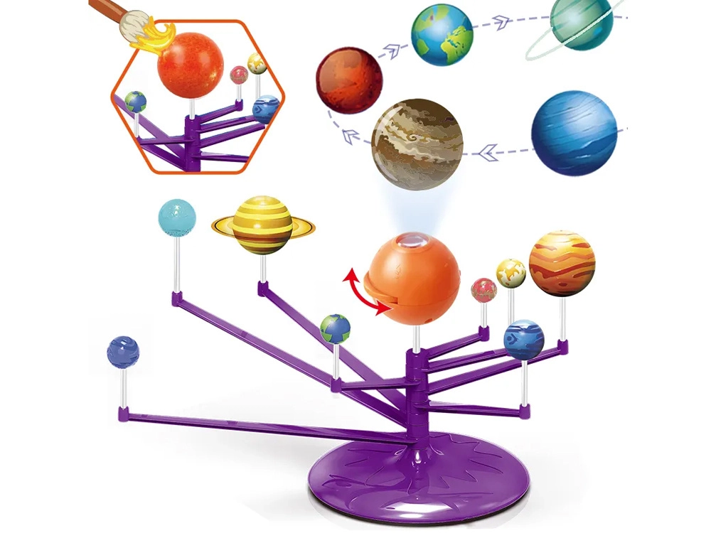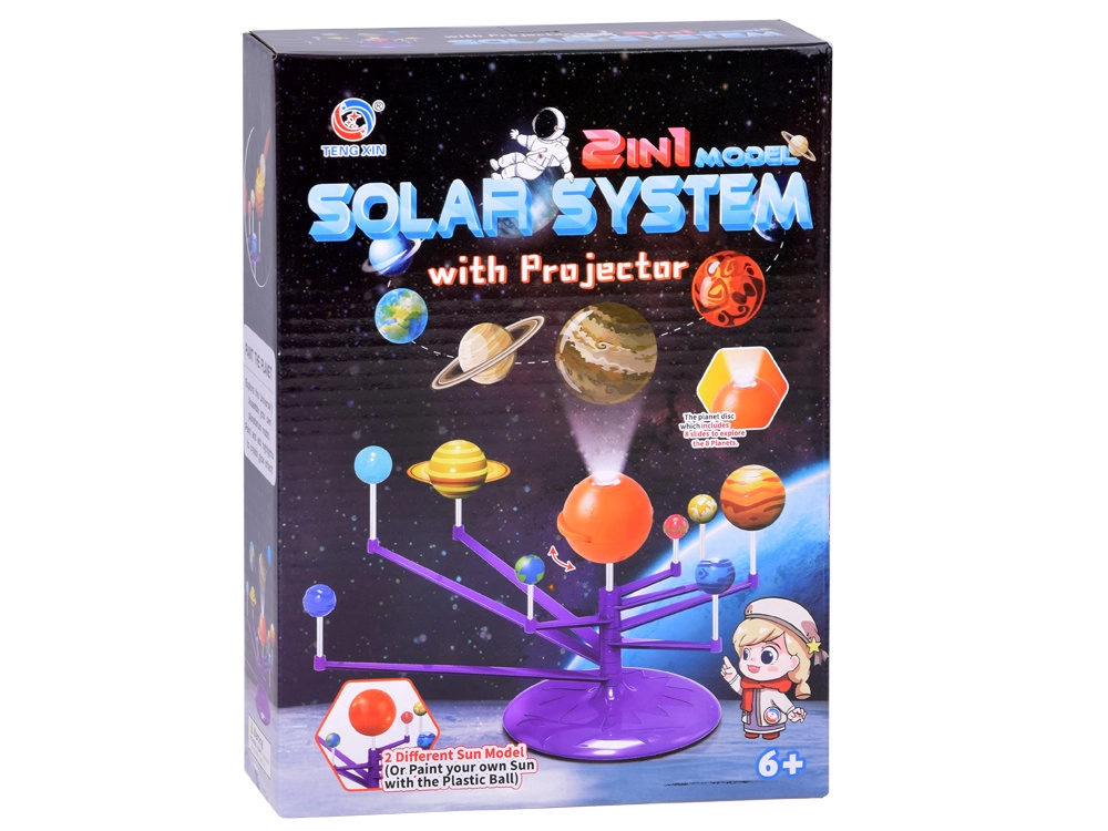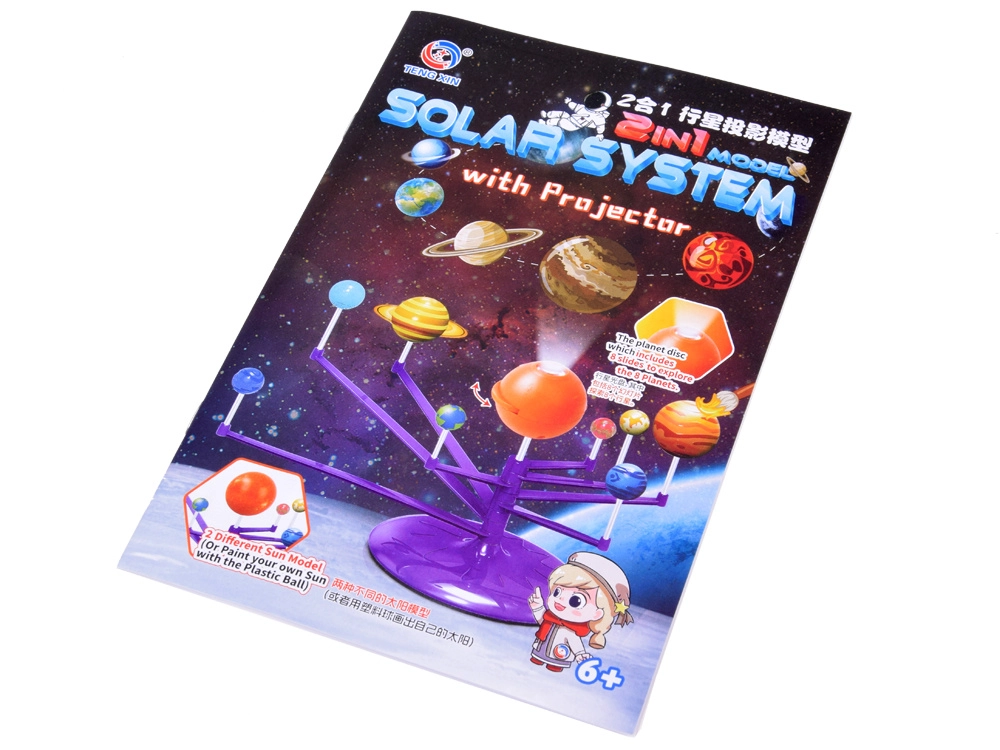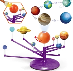 Mini Saules sistēmas modelis 2 vienā ir interaktīva, radoša un izglītojoša rotaļlieta, kas ļauj bērniem salikt un patstāvīgi apgleznot planētas. Tajā ir iekļauta oranža bumba, kas attēlo Sauli ar projektoru, kurš projicē planētas uz griestiem.