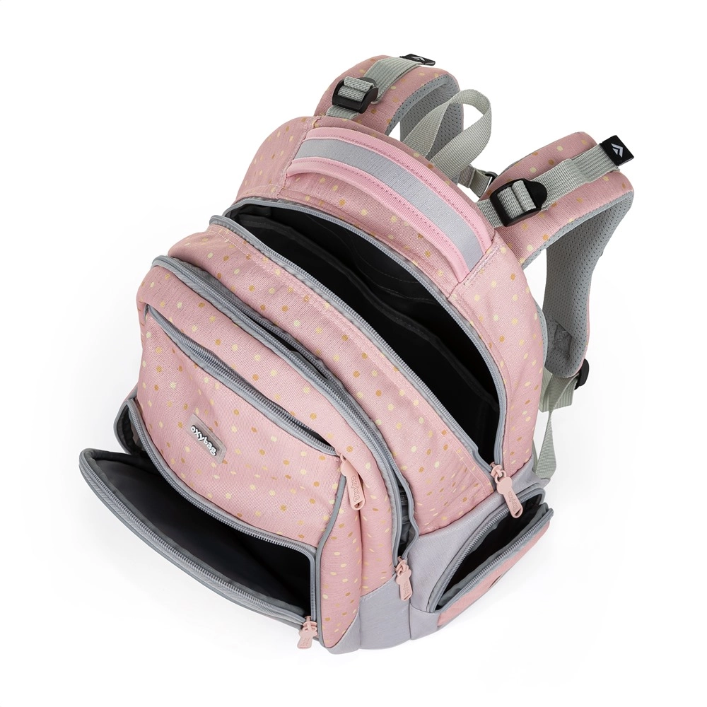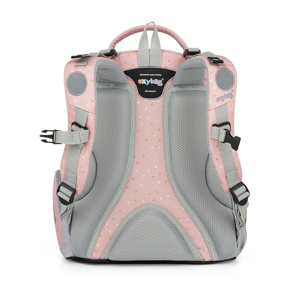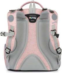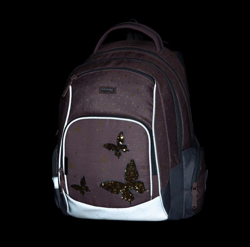 Vieglā un ietilpīgā skolas mugursoma OXY GO Tauriņš 1.–3. klasei izceļas ar stilīgu dizainu, ergonomiski veidotu un elpojošu muguras daļu, regulējamām lencēm un atstarojošiem elementiem drošībai. Tā piedāvā 22 l tilpumu, izturīgu ūdensnecaurlaidīgu dibenu un daudz kabatu perfektai skolas piederumu organizācijai.
