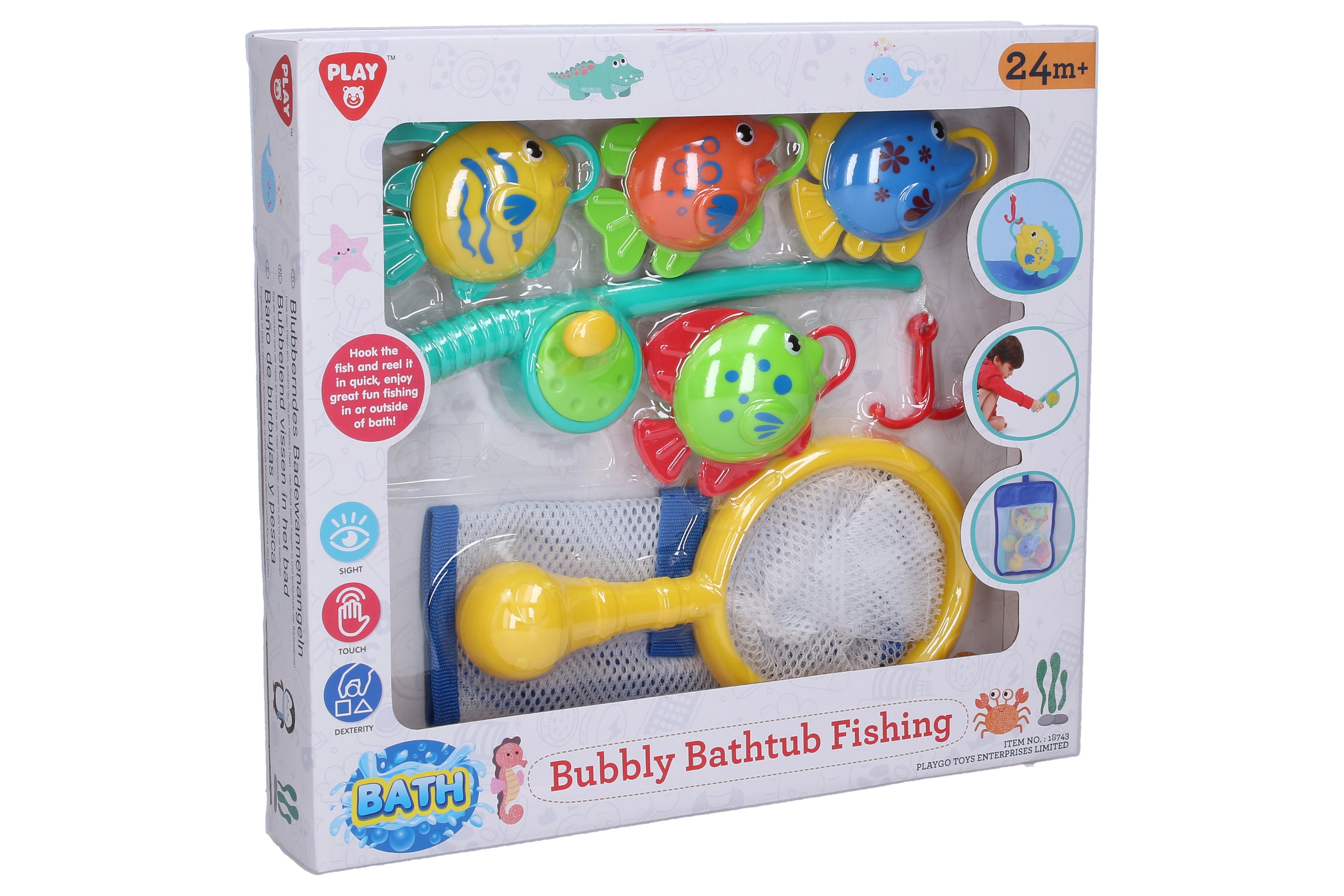 Šis rotaļīgais Playgo komplekts padarīs bērna laiku vannā patīkamāku. Atliek iemest mazo makšķeri un ķert zivtiņas vai arī tās uzsmelt tīkliņā – vienkārša un saistoša nodarbe, kas veicina koncentrēšanos un pacietību.