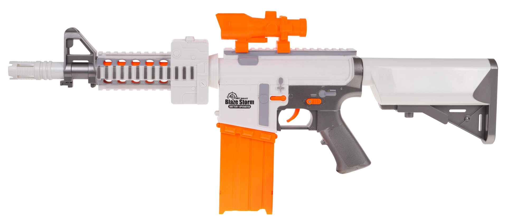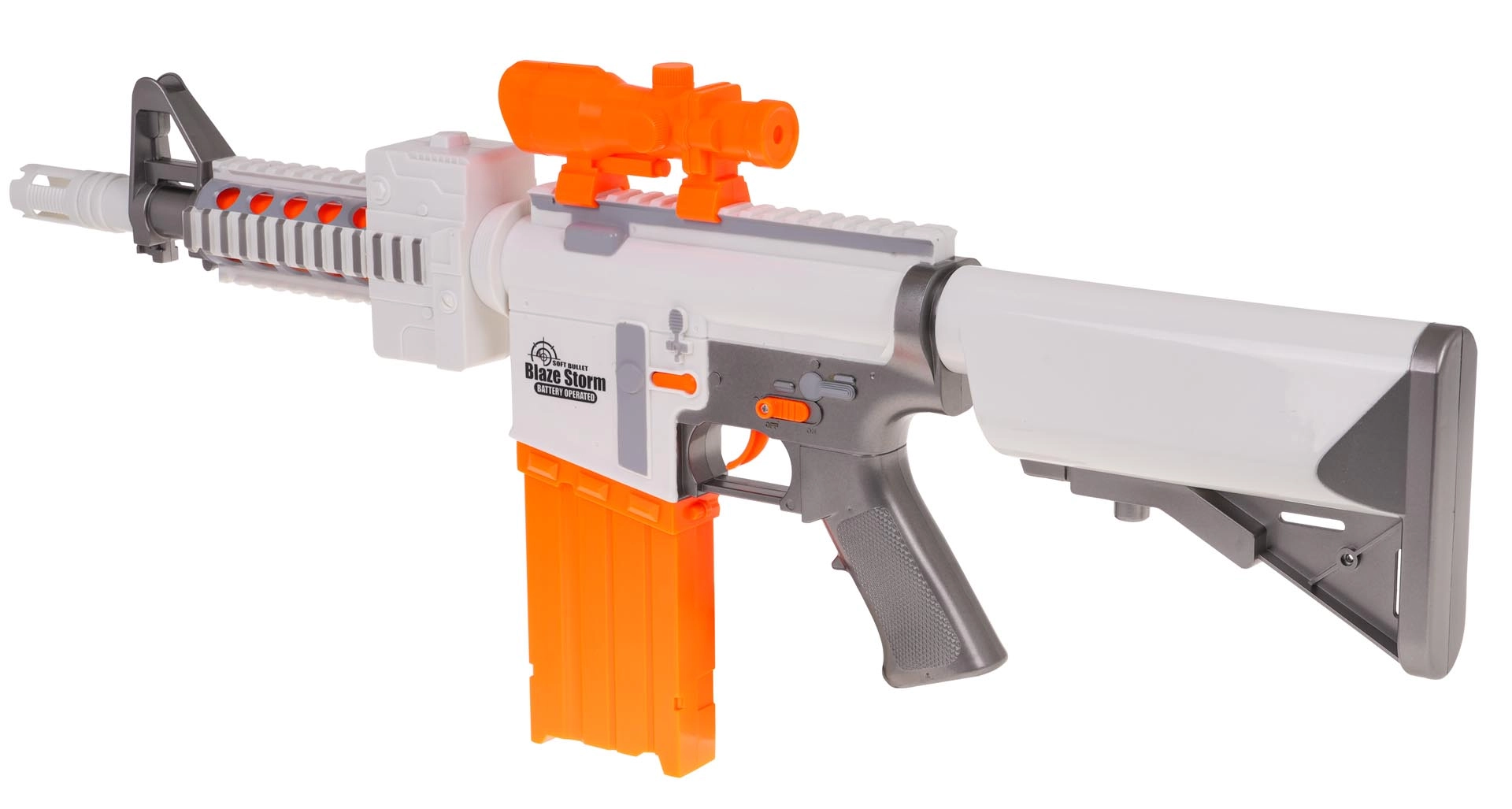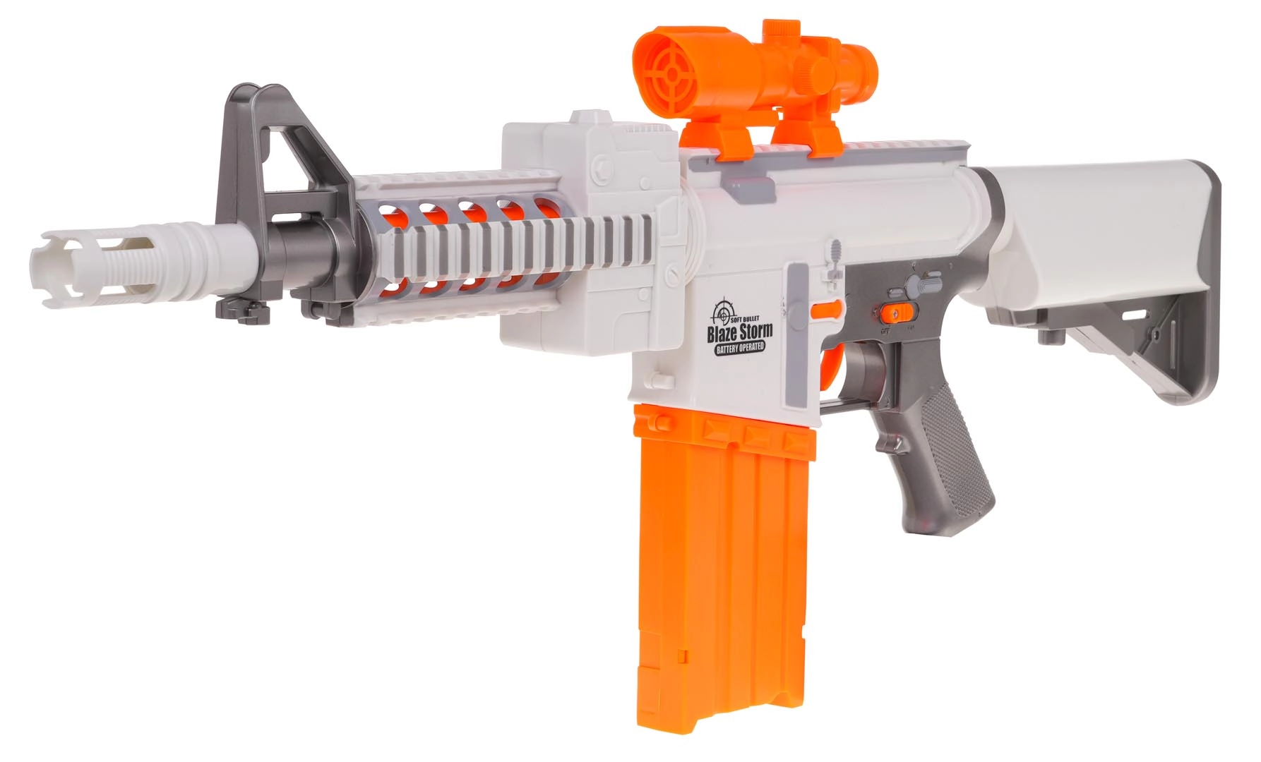 Izbaudi aizraujošu, dinamisku izklaidi ar BLAZE STORM blasteri pievilcīgā baltioranžā krāsu salikumā. Pateicoties pusautomātiskajam režīmam, viegli izšausi bultu pēc bultas, un ar lielo, izvelkamo 10 lādiņu aptveri darbība tik drīz nebeigsies. Regulējamais tēmēklis palīdzēs trāpīt precīzāk, bet putu bultas ar mīkstu gumijas galiņu ir saudzīgas spēles laikā.