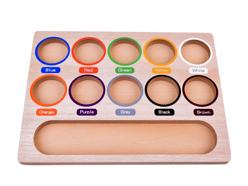 - koka pamatne ar 11 atverēm un krāsu nosaukumiem angļu valodā,