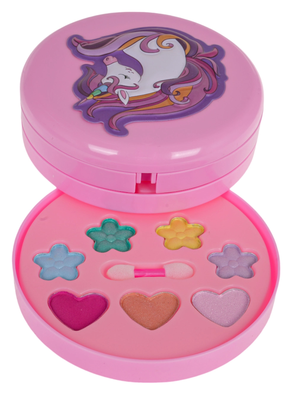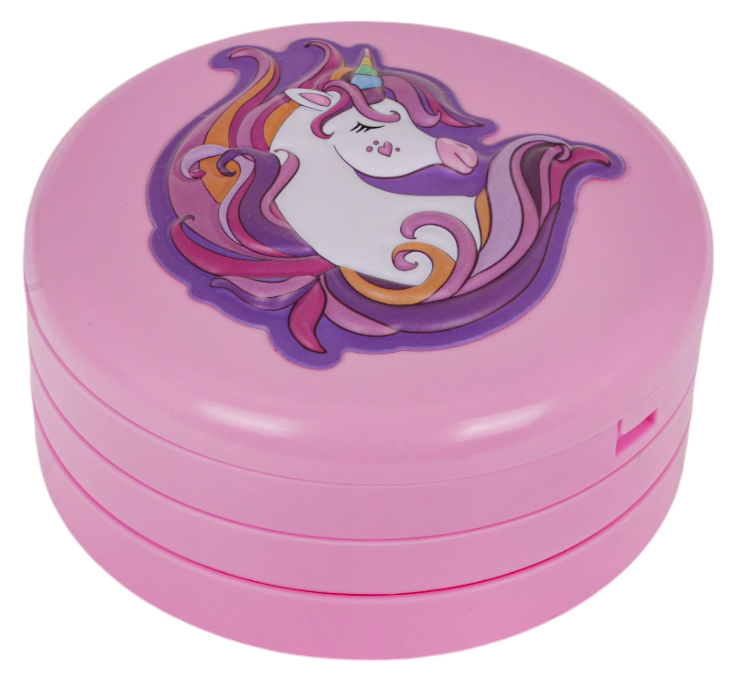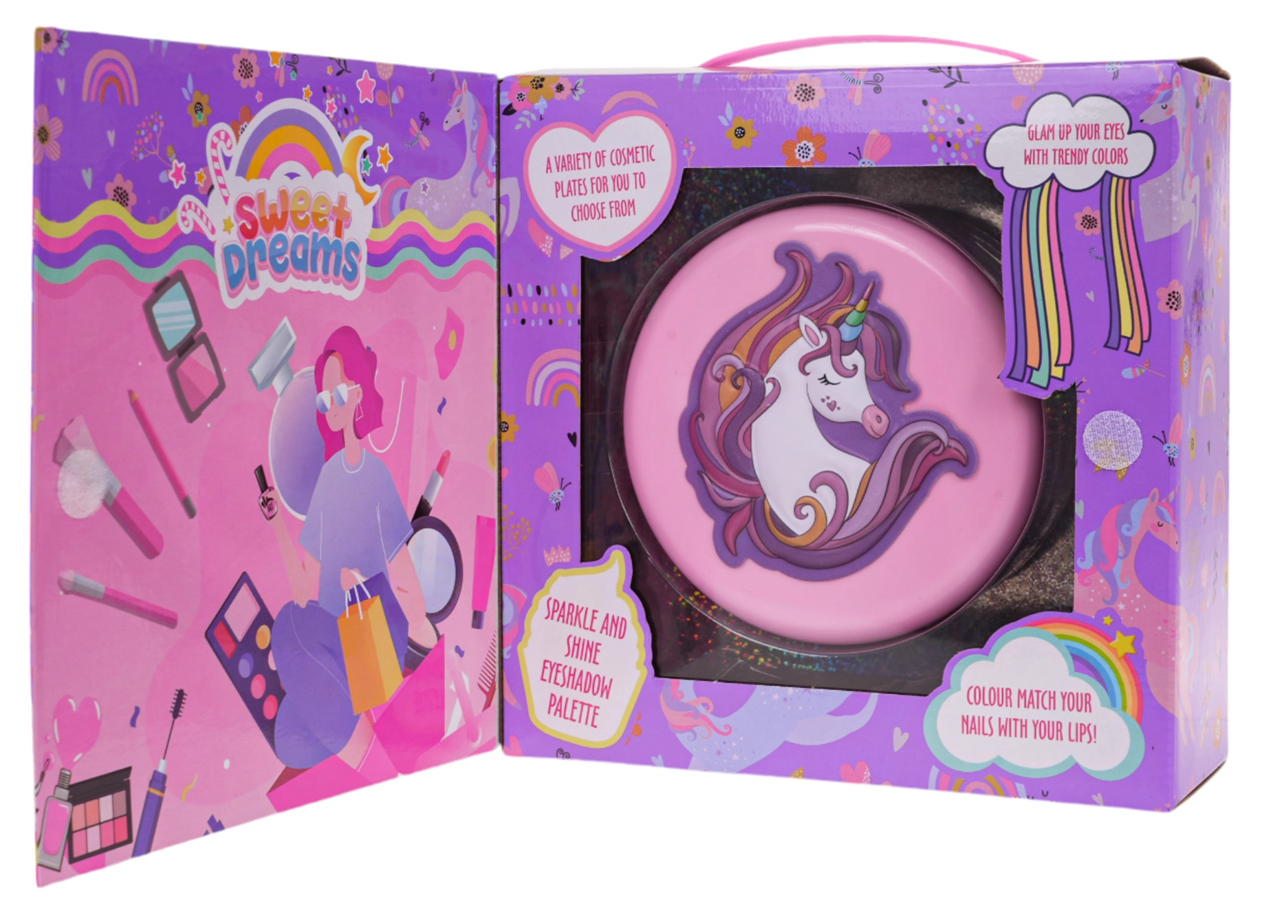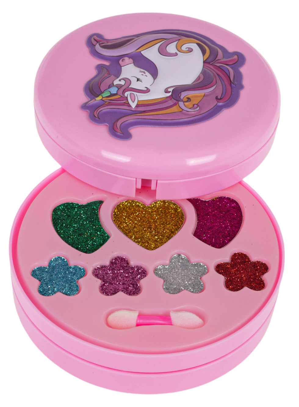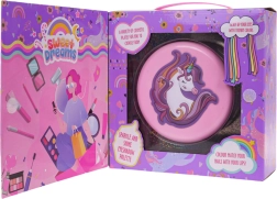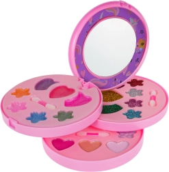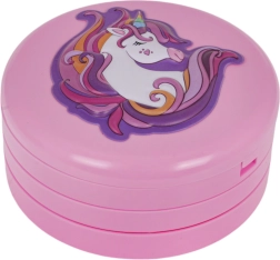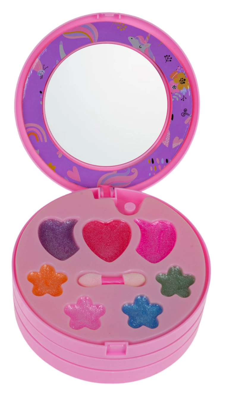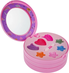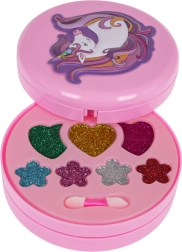 Izvelkama rozā rotaslietu lādīte ar vienradža motīvu slēpj krāsainu fantāzijas pasauli: puķītes, sirsniņas un zvaigznītes, kas pildītas ar ēnām, balzamiem un mirdzumiem. Pateicoties integrētajam spogulītim un iekļautajiem aplikatoriem, bērni var droši un ērti iepazīt grima pasauli.