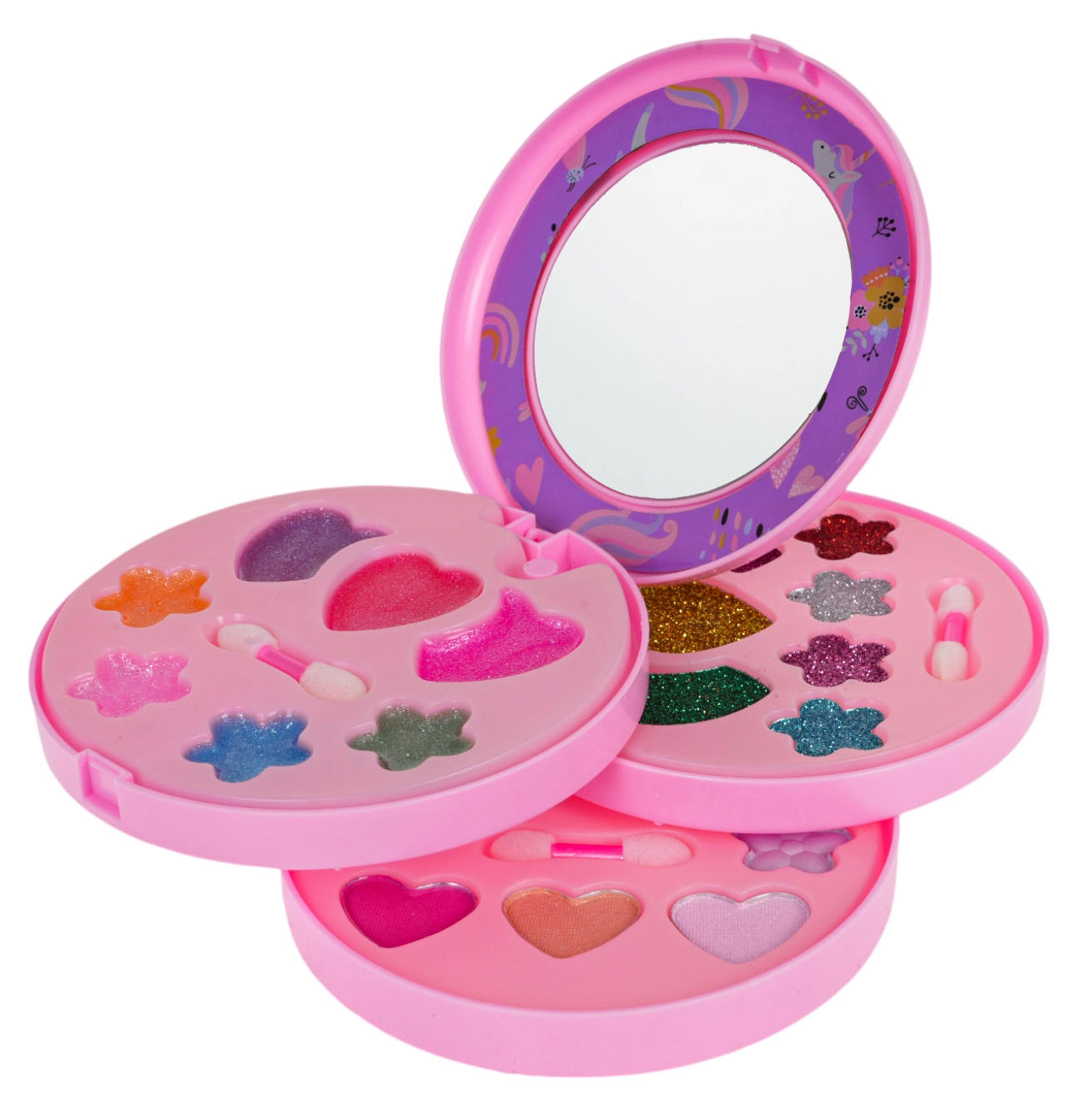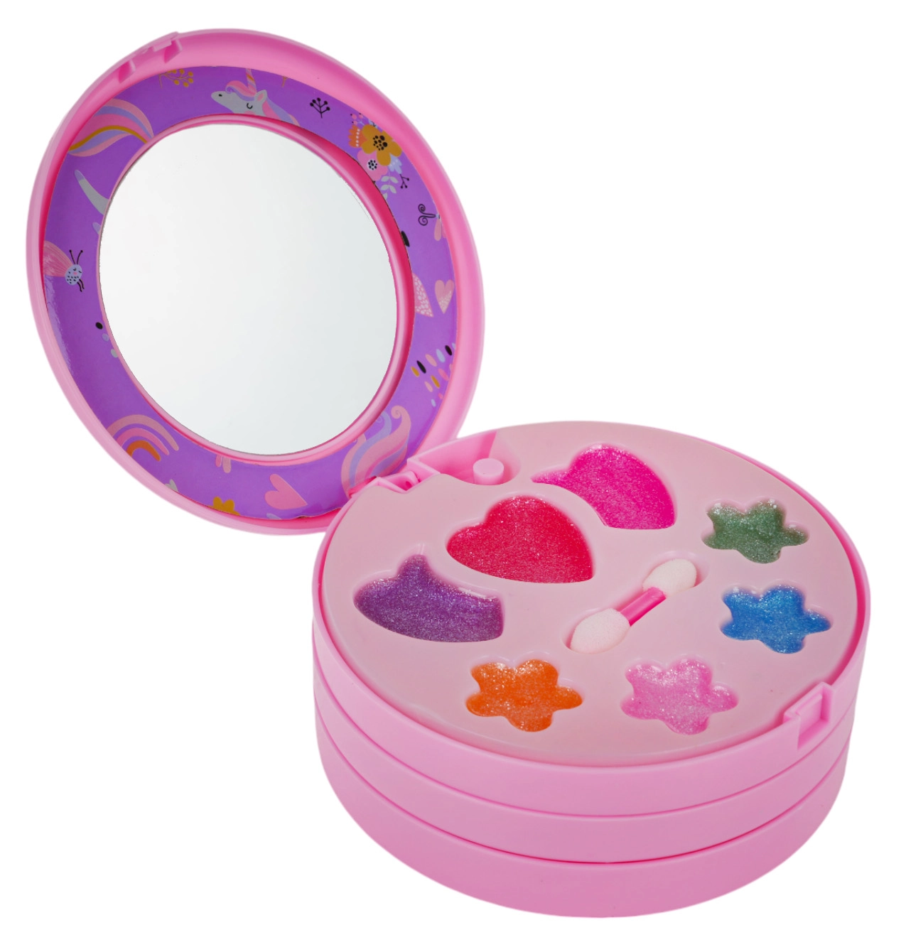 Komplektā ir spogulītis un divpusēji aplikatori, lai bērni varētu ērti uzklāt ēnas, spīdumus un mirdzumus.