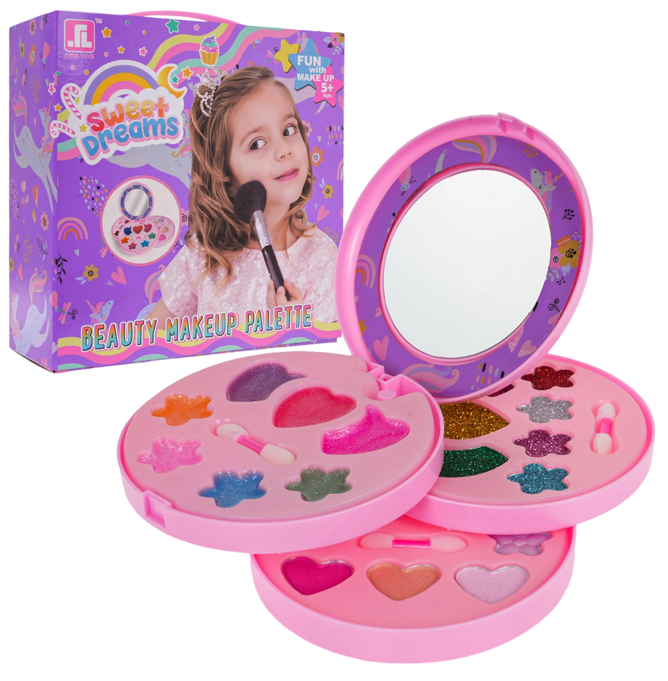 Burvīgs bērnu grima komplekts ar vienradža motīvu izvelkamā rotaslietu lādītē iepriecinās ikvienu mazo dāmu no 5 gadu vecuma. Tas satur košu ēnu, spīdumu un mirdzumu paleti mīlīgās formās ar praktisku spogulīti un aplikatoriem. Kosmētika ir droša bērna ādai un viegli nomazgājama, tāpēc gan izklaide, gan uzkopšana ir bez raizēm. Veicina radošumu un attīsta krāsu izjūtu un estētiku.
