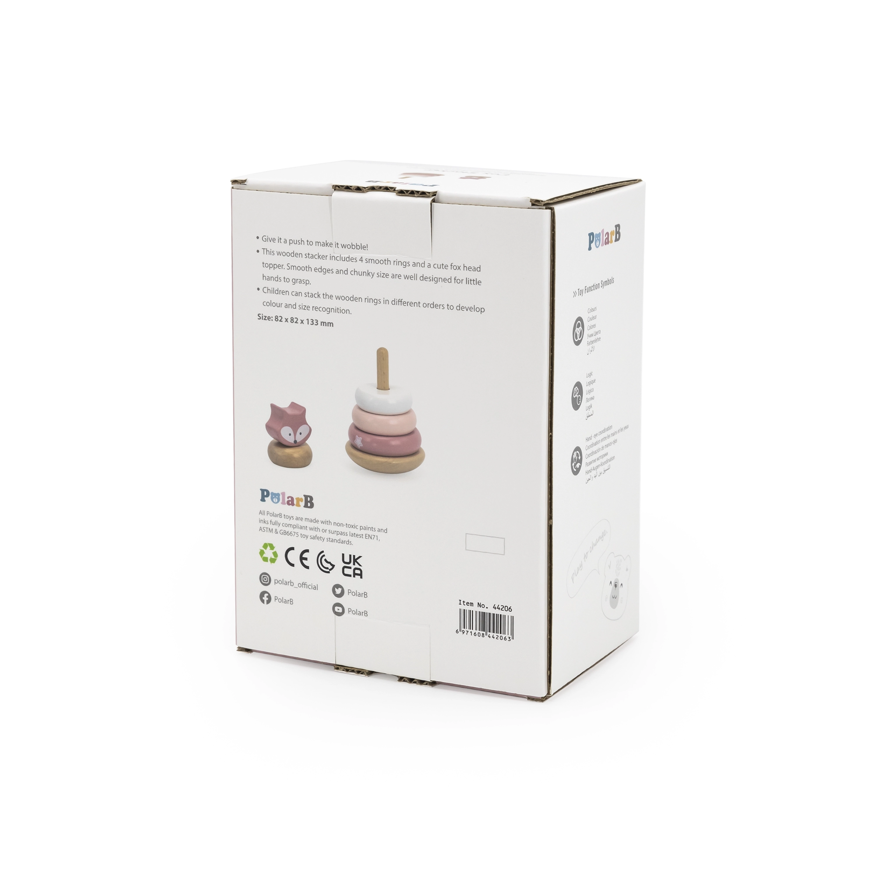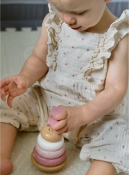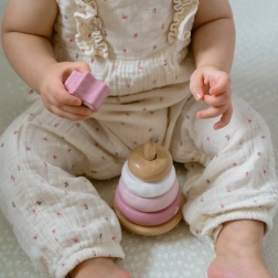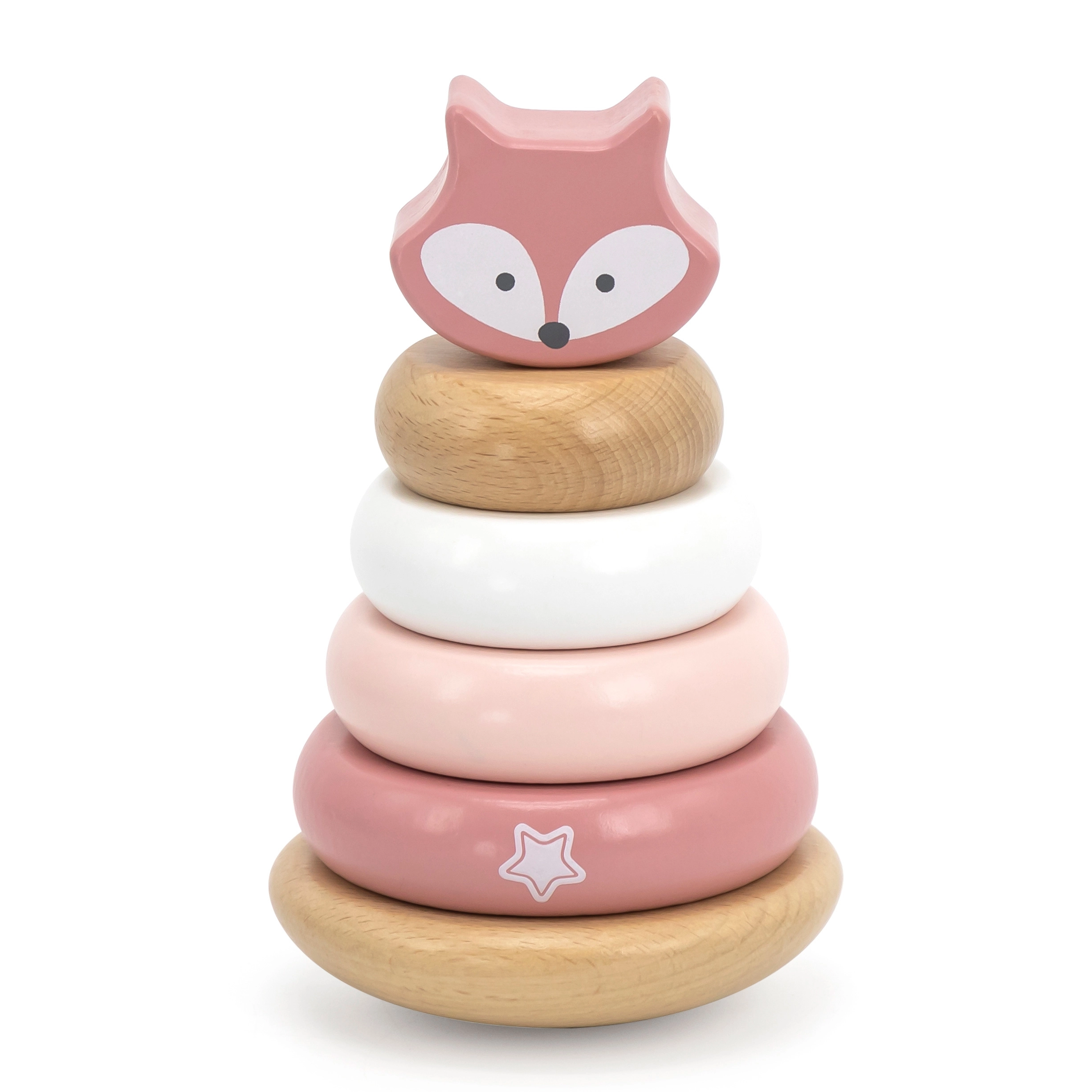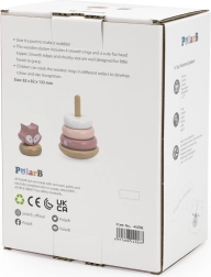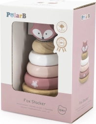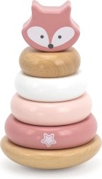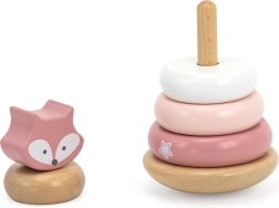 Šī koka stāvošā rotaļlieta piedāvā 6 detaļas maigos pasteļtoņos, tostarp augšējo daļu ar lapsas galviņu. Bērni uzver gredzenus uz centrālā tapa pēc izmēra, krāsas vai pēc fantāzijas – tā viņi trenē loģisko domāšanu, pacietību un telpisko uztveri.