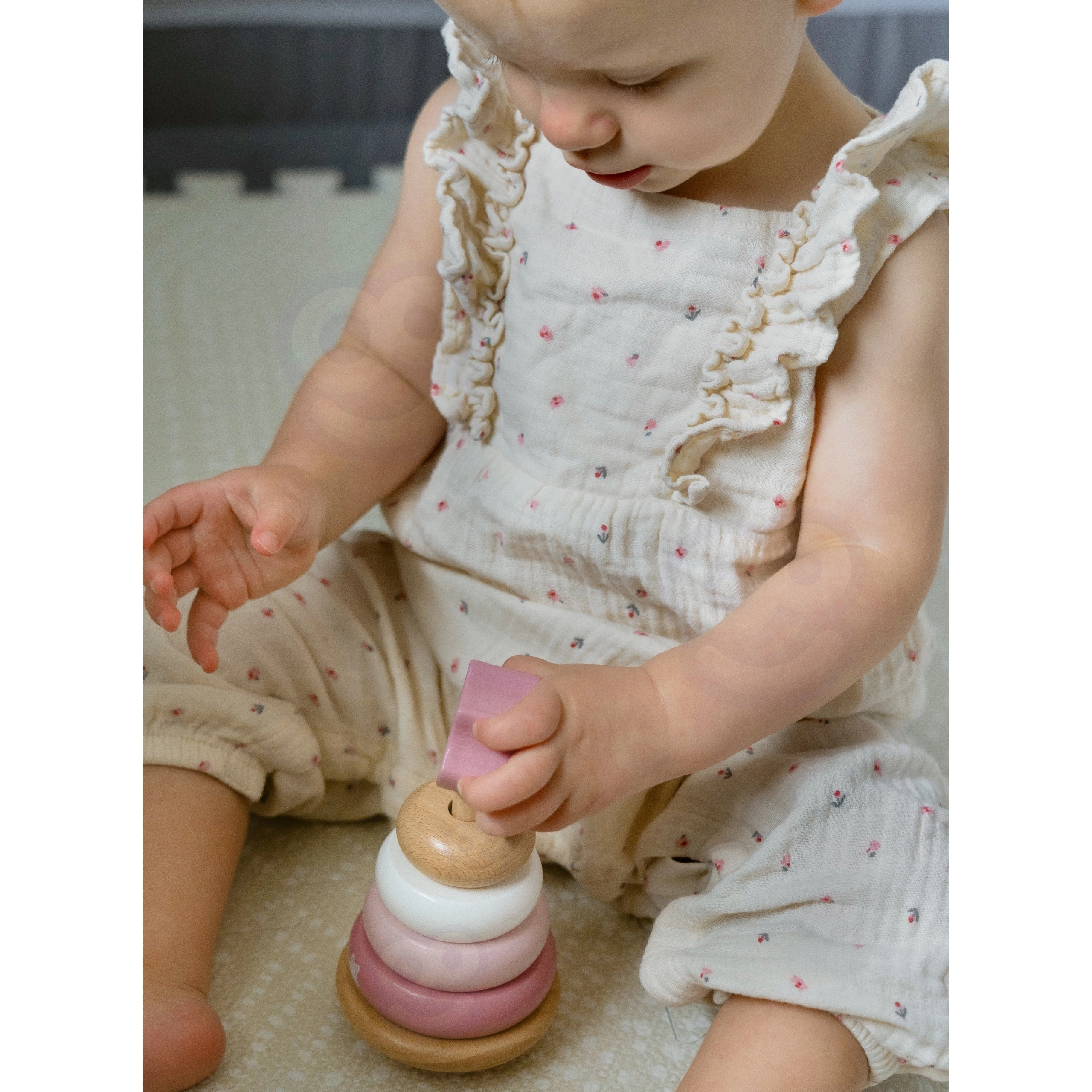 Gredzenu uzvēršana uz tapa dabiski trenē satvērienu, precizitāti un roku–acu koordināciju – ideāli pirmajiem motorikas izaicinājumiem.