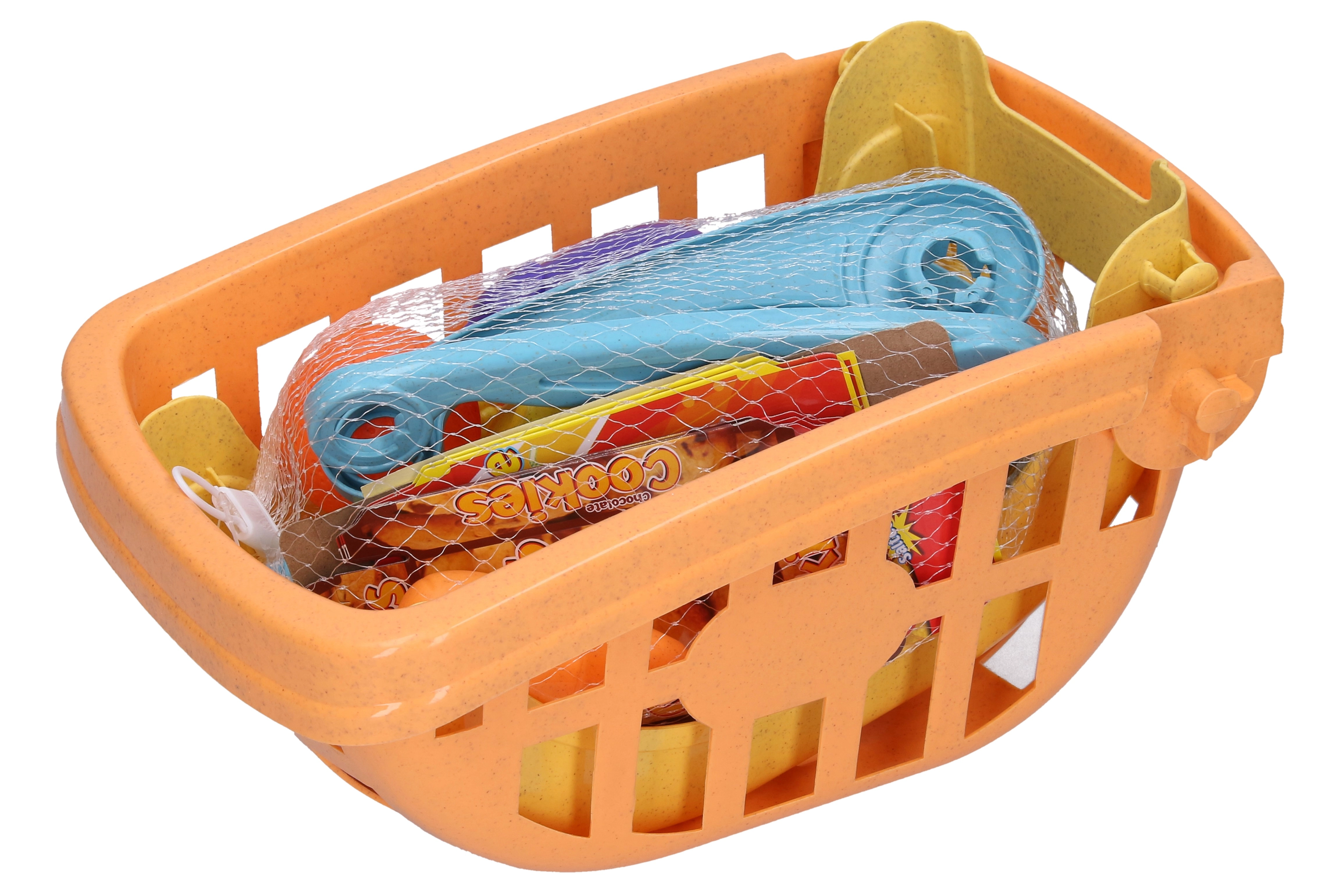 Komplektā ietilpst grozs/ratiņi un daudzveidīgs pārtikas klāsts – augļi, dārzeņi, sula, čipsi un cepumi. Bērni vingrinās pārtikas nosaukumos, šķirošanā un vienkāršā skaitīšanā. Kompaktais 41,5 cm izmērs nodrošina, ka ratiņi iederas arī mazākās telpās.