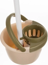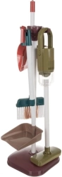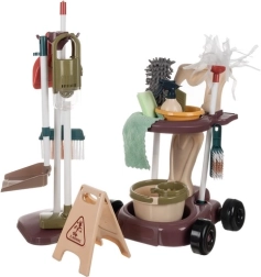 Pārdomāts izkārtojums ļauj visus piederumus turēt pa rokai: apakšā spainis ar izspiedēju mopam, augšā bļodiņa, smidzinātājs un ūdens tīrīšanas gumija. Speciālas atveres un āķi notur mopu, putekļu slotu un drāniņas, bet stabilais statīvs pārskatāmi novieto birsti, slotiņu un lāpstiņas. Uzkopšanas spēle attīsta atbildību, sīko motoriku un kārtības izjūtu.